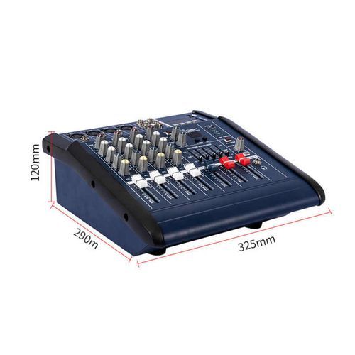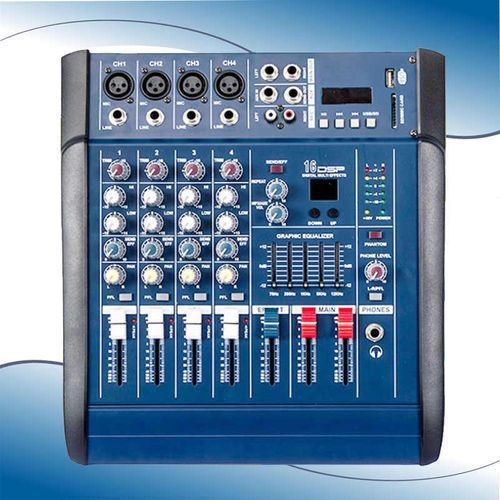 Feature: Mono Microphone input, A stereo input Built-in 16 kinds of LCD digital display, digital effects, built-in 48V phantom power for condenser microphones, use professional recording Built-in five- band equalizer, 2 line (L/R) audio output 1 to send output, 1 return input, A stereo mix output Each has a monitor switch, 1 line to high-fidelity headphone output power (1W) Head phone monitoring function.Specification: Model: PMX402DU-USB, Channel: 4 CHS/N Ratio:>105dB THD: