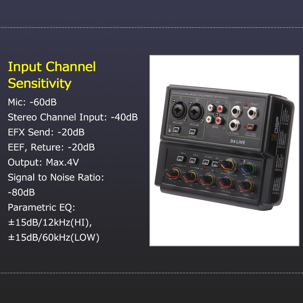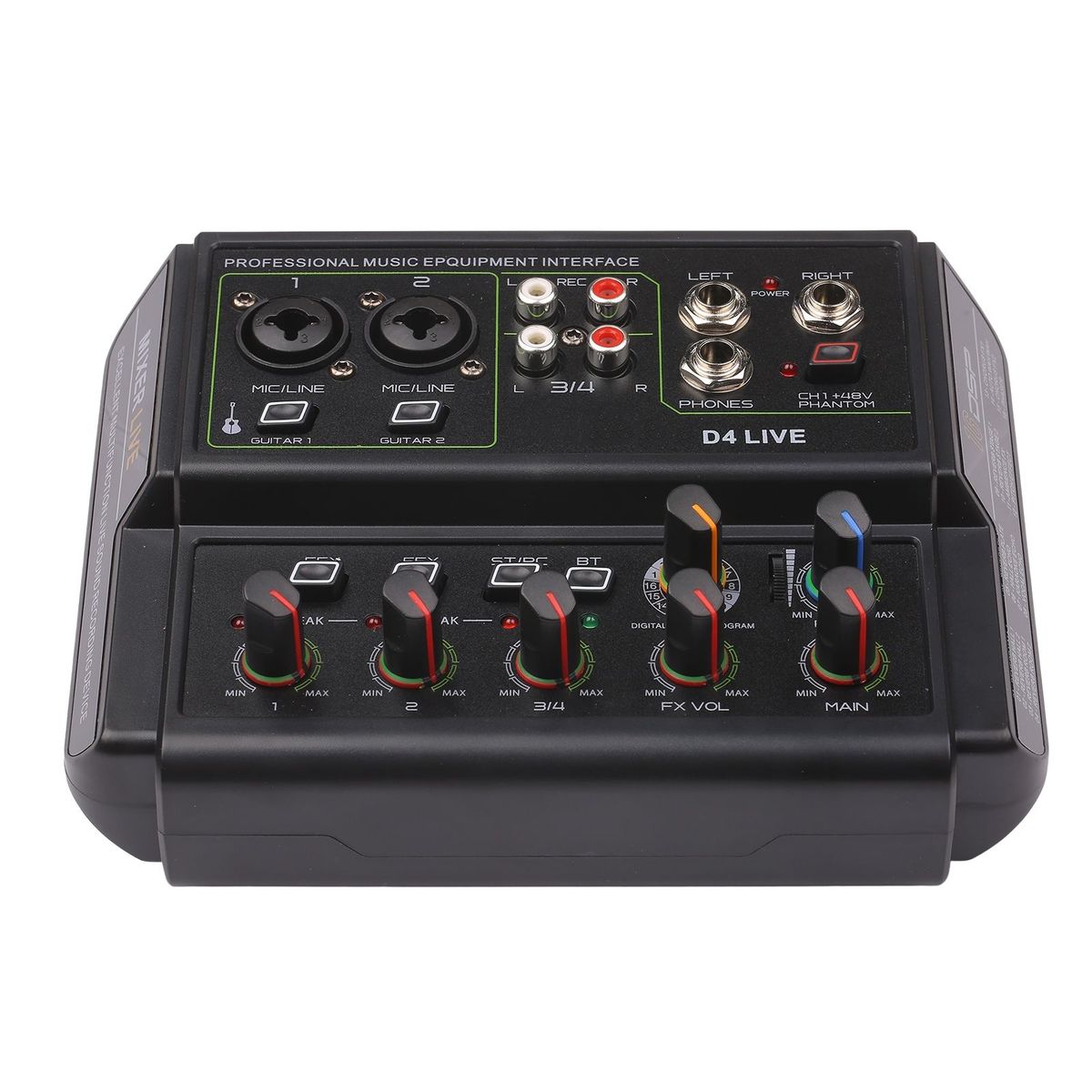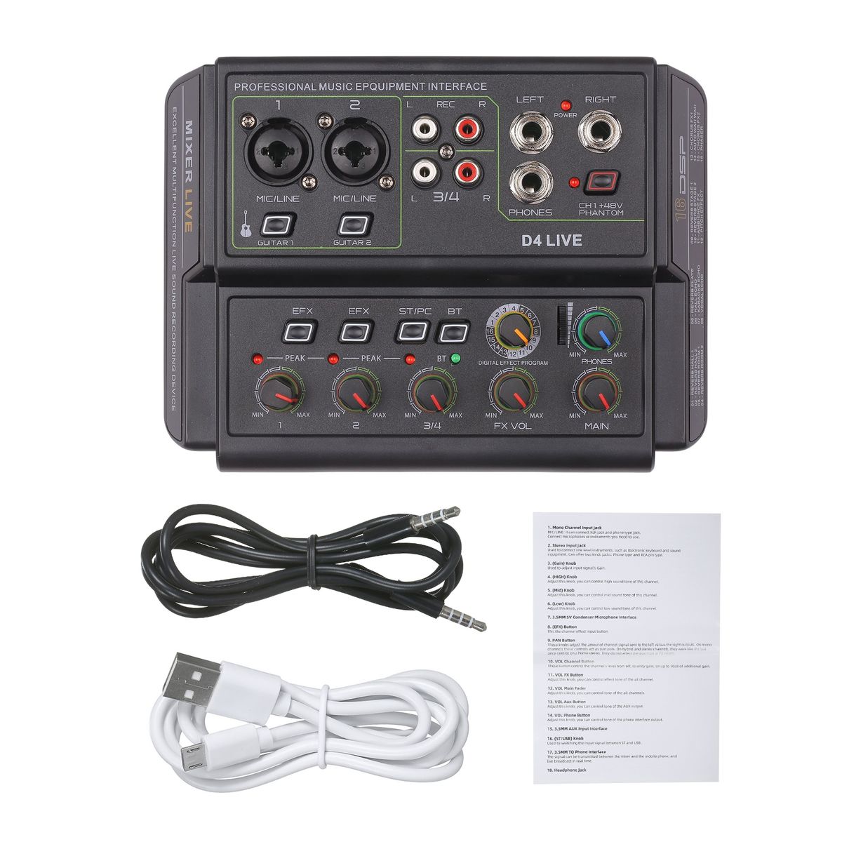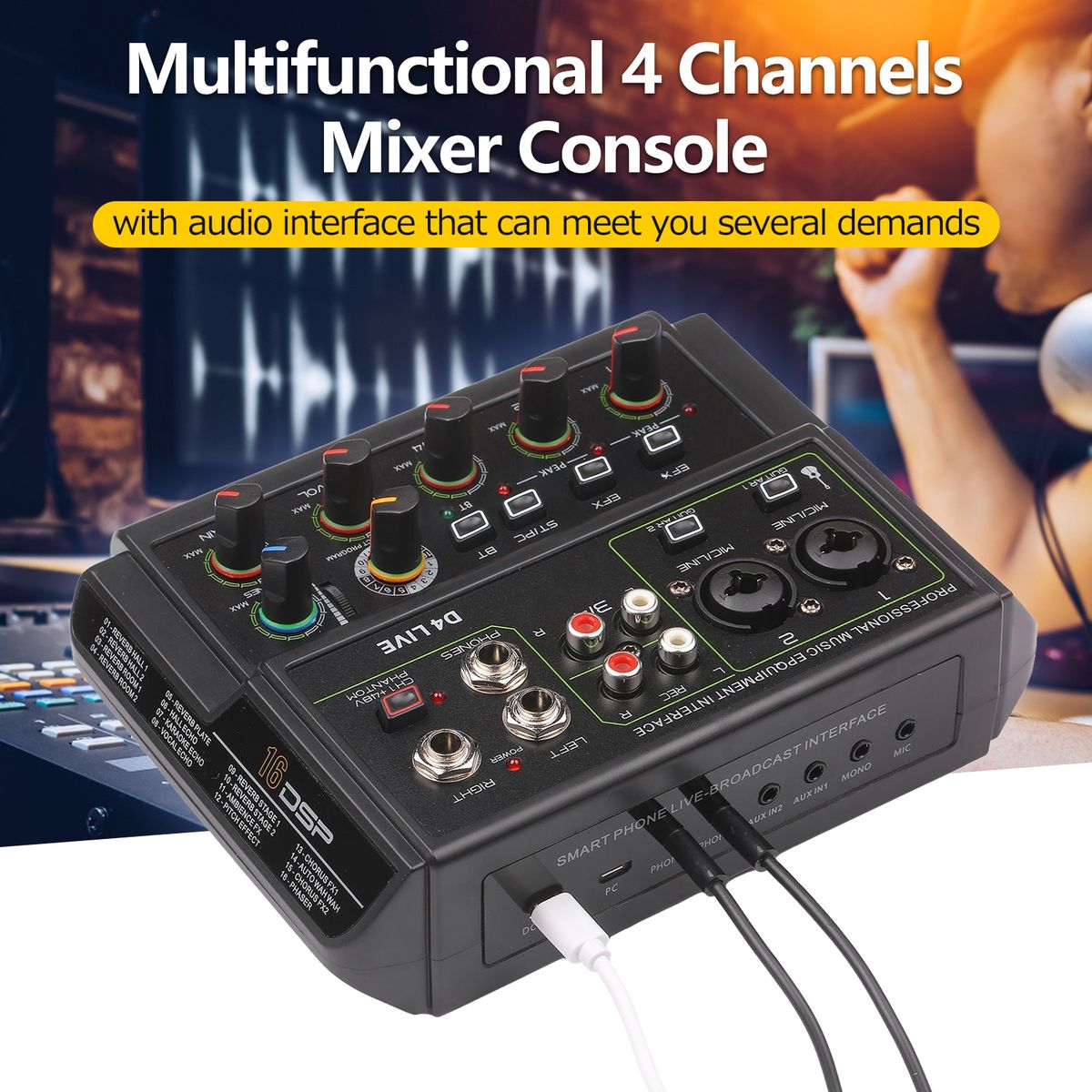 A multifunctional 4 channels mixer console with audio interface that can meet you several demands, such as home music production, live streaming, karaoke, phone live broadcast, etc.