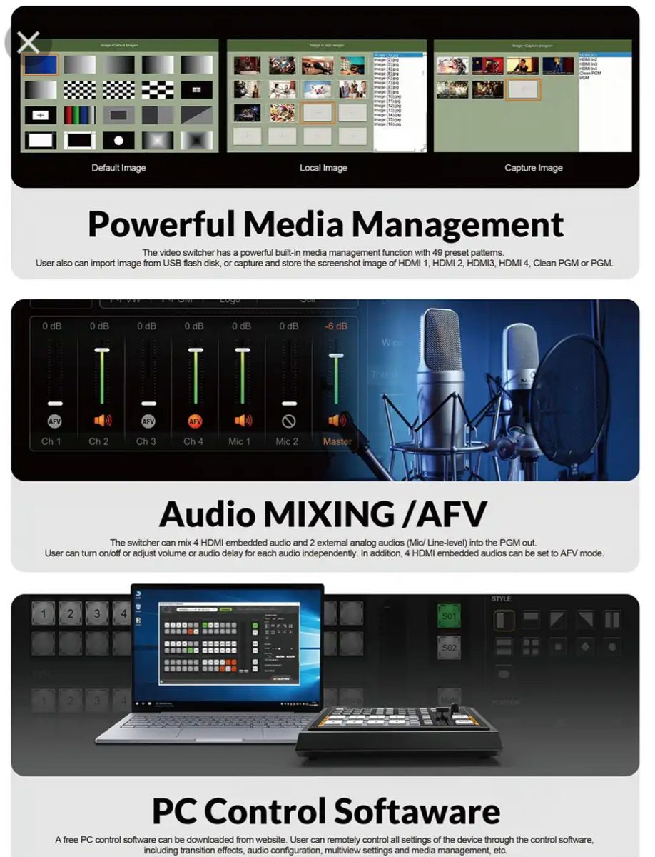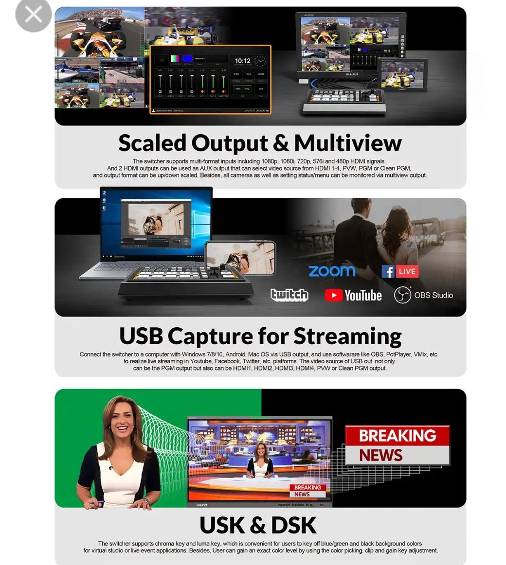 the micro 4 channels video mixer can be use in various fields like churches,live games,live sports,virtual studio,education,education,internet,concerts and so on