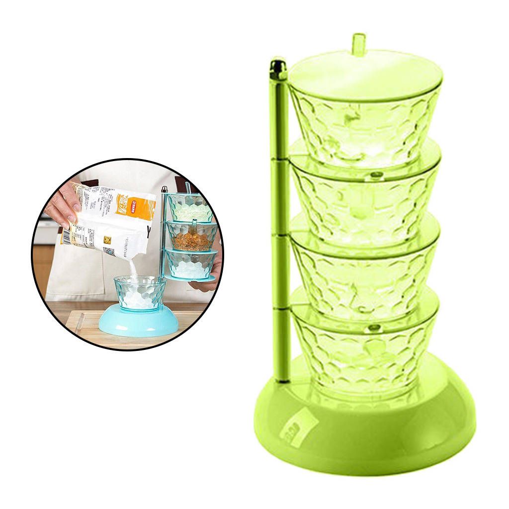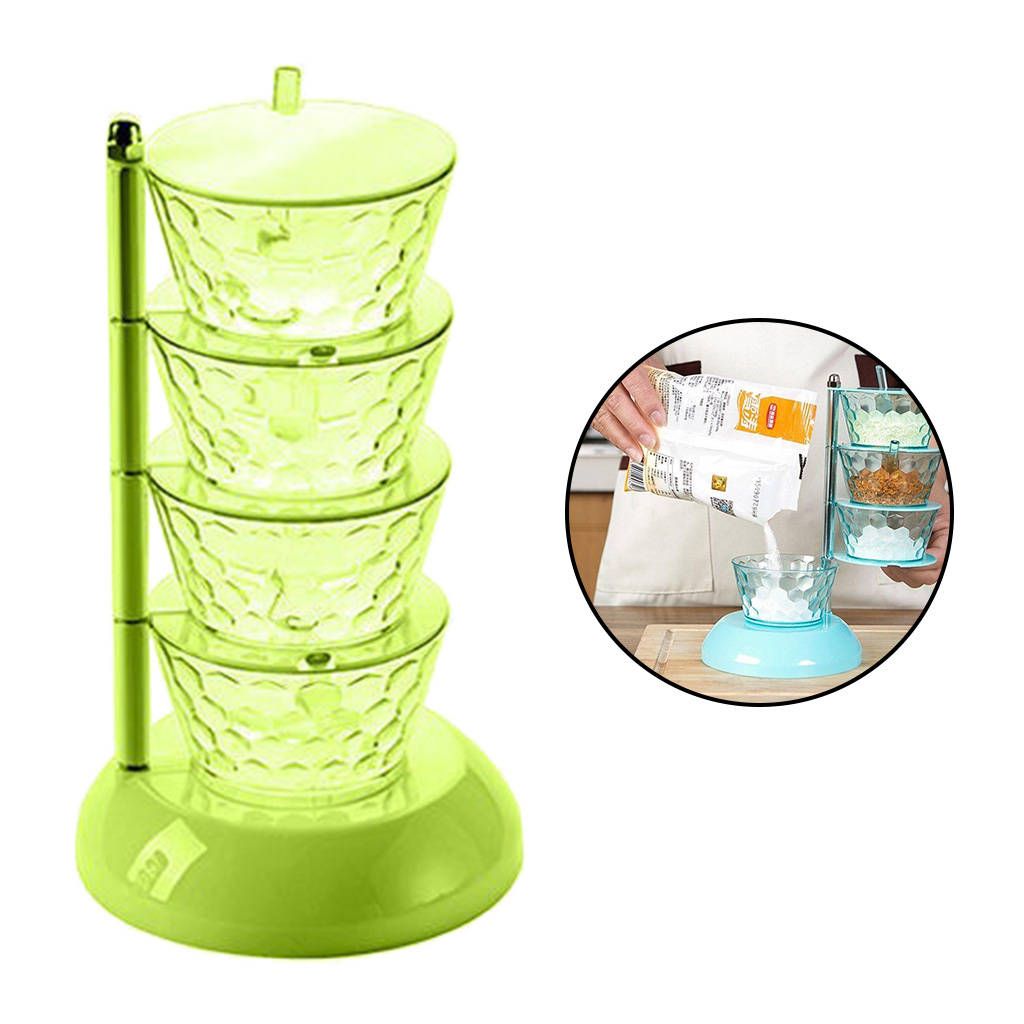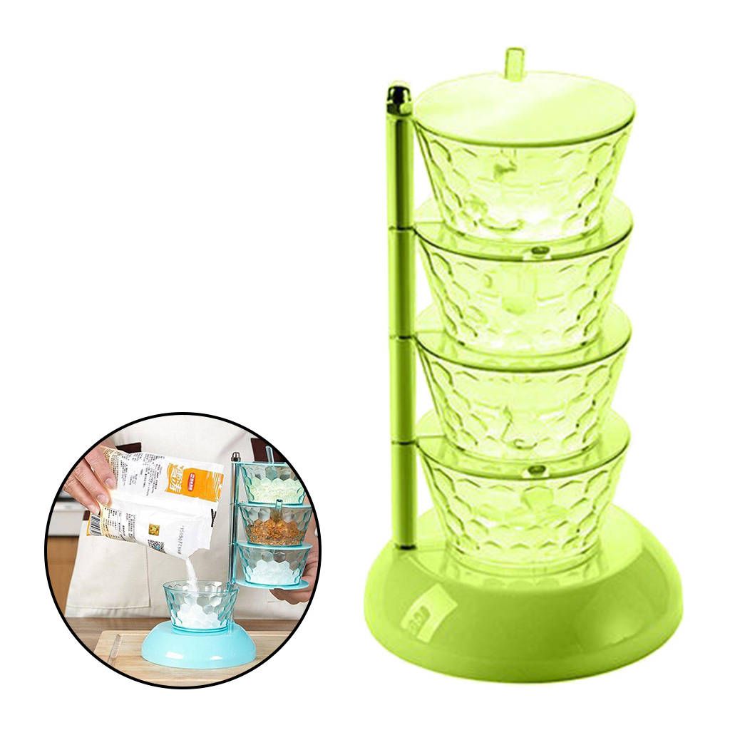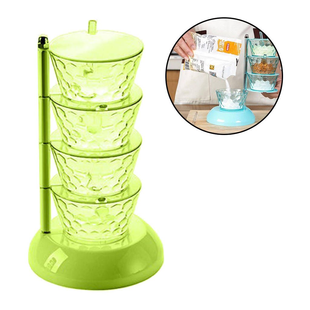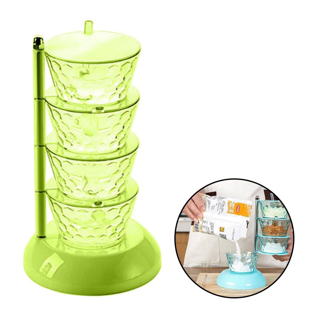 Sturdy & Durable - Spices boxes made by Durable & Food Grade PS Material,which makes them completely safe for storing food items.4 Components - 4 compartment condiment dispensers and 4 serving spoons included, with a nonslip tray to protect all seasoning box.Saving Space - Seasoning box rack can be stacked and placed to collect the seasonings of the bottles and cans to release the space on the countertop.Application - Multi-Purpose for a variety of condiments,pepper, sugar, salt, spice, chicken broth , corn starch and more.Eco-friendly,not easily damaged,durable and reusable.