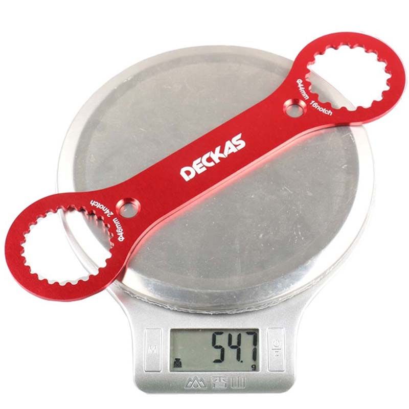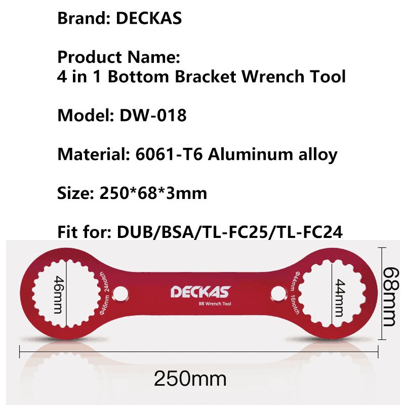 - Product name:4 in 1 Bottom Bracket Wrench Tool - Color: Red - Brand: DECKAS - Metarial: 6061 T6 Aluminum alloy - Size:250*68*3mm - Fit for:SRAM DUB / SHMANO BSA / FC-25 / FC-24 - Weight: about 55g