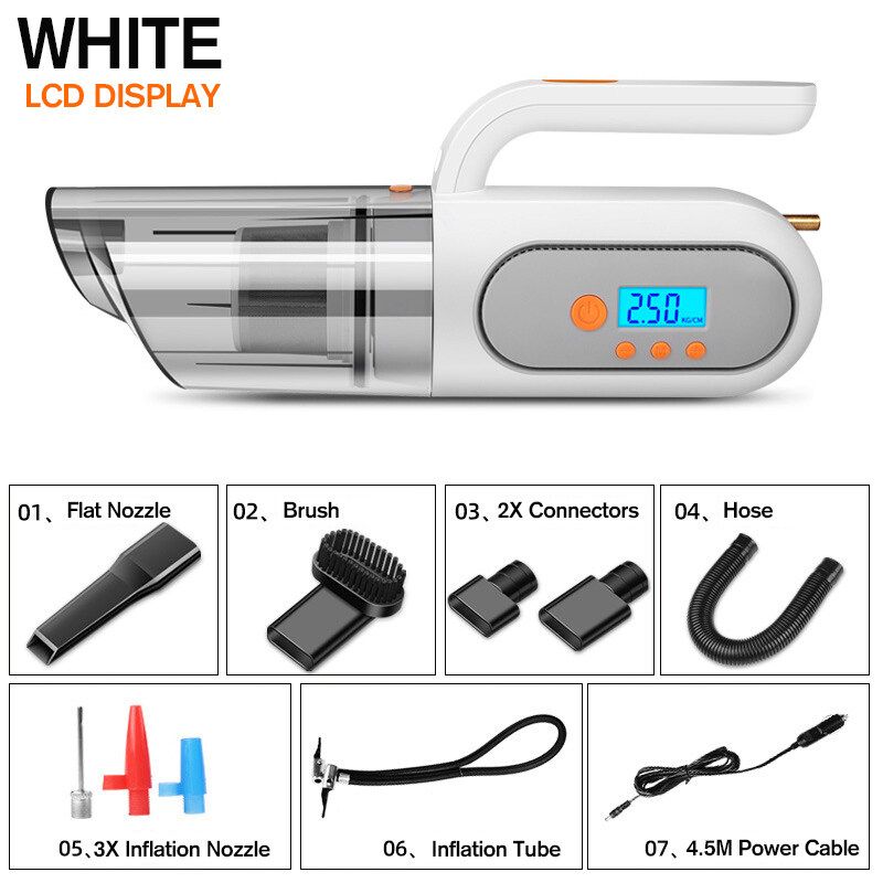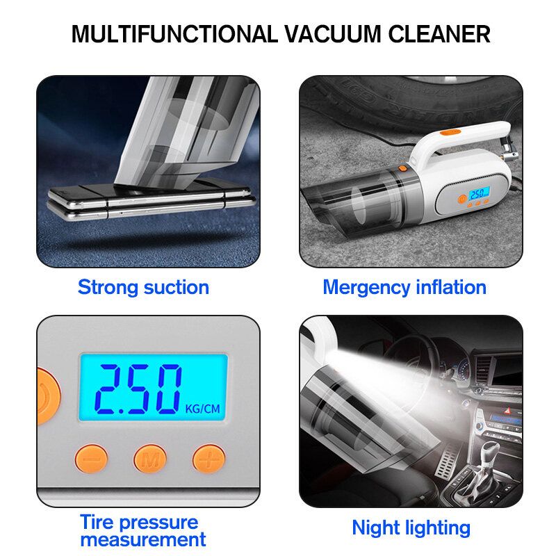 - 4 in 1 Multifunction Vacuum Cleaner: Vacuum Cleaner+Inflator+LED Lighting+Tire .
