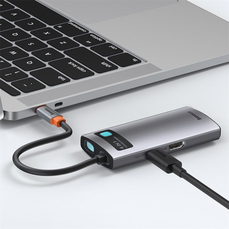 Use just 1 input of your laptop to gain the ability to connect several different devices to it. Hub by Baseus is equipped with 4 ports, such as USB-C, HDMI, USB 2.0 and USB 3.0, so this small device gives you a lot of possibilities and allows you to significantly increase the functionality of your computer!