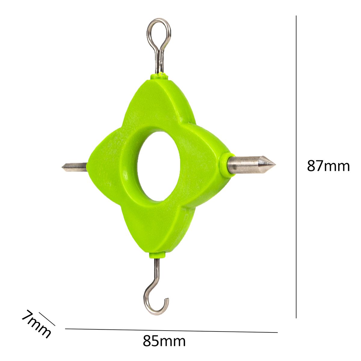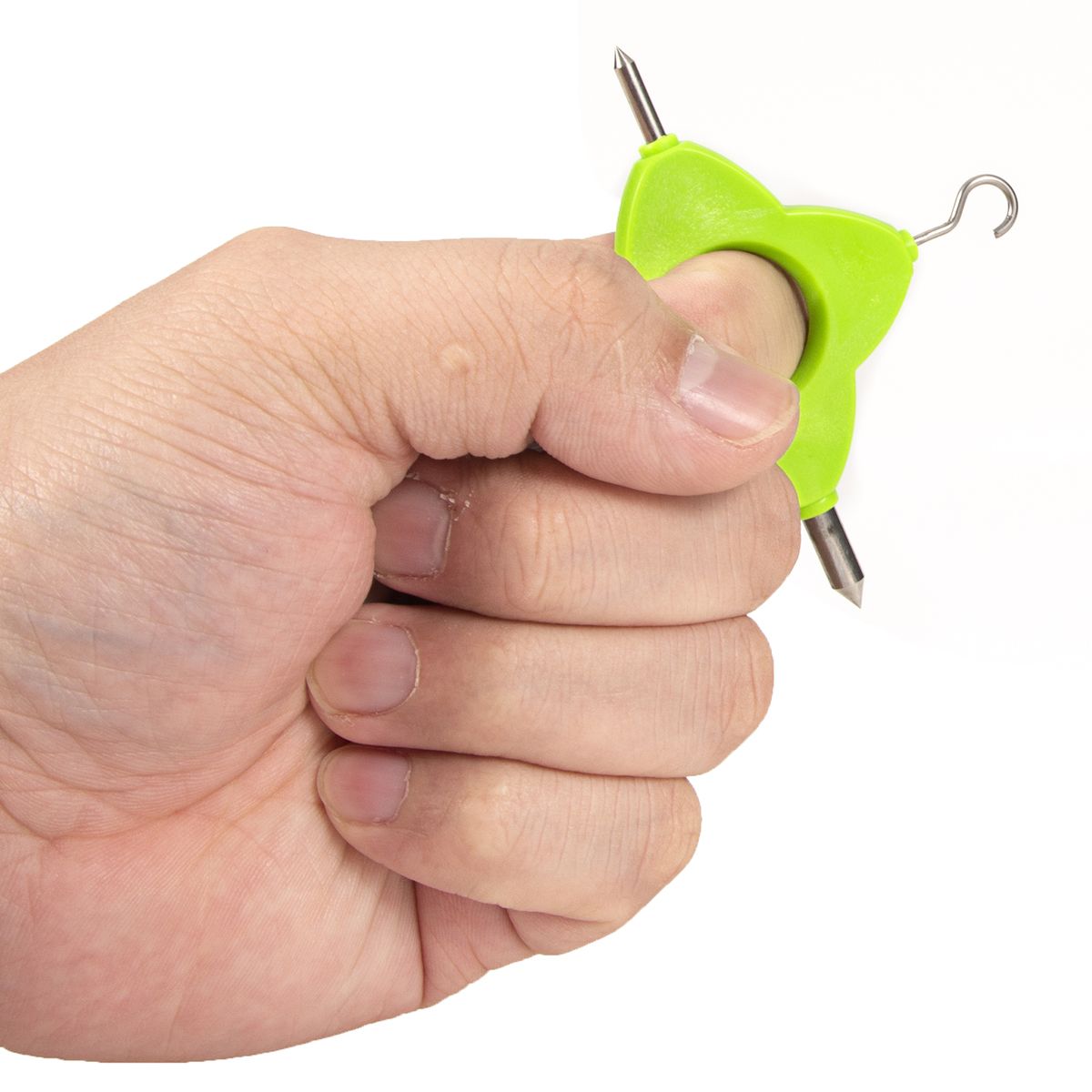 With a hook for holding swivels to tighten knots on carp rigs.