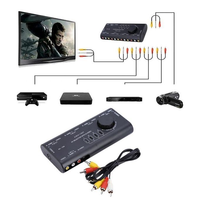 Easy installation and operation. No power supply and software drive needed. Light weight, portable size, easy to carry. Convenient switch control--just pull the switch point at the relative AV input 1, 2, 3, 4. You can switch 4-group AV audio-video signal input and 1-group output to the television, DVD, VCD, TV game, VCR station selector, satellite TV, cameras, etc.