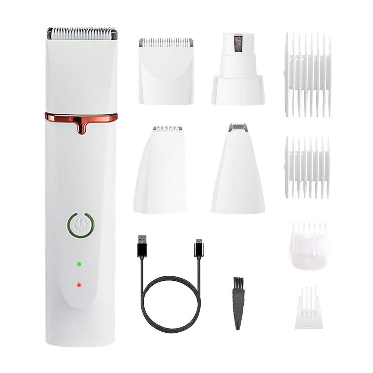1 Piece Host1 Piece Nail Grinding Head1 Piece Toes Hair Head1 Piece Paw Hair Head1 Piece Head4 Pieces Limit Combs (3mm/6mm,9mm/12mm,4mm,5.5mm)1 Piece Brush1 Piece USB Cable1 Piece Manual1 Piece Colorful Box