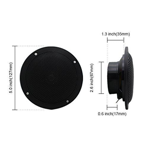 - DIAMENSION:These marine speakers are easy to install for any flat surfae, with the 6.5 feet wirings that omes with the pakage. The outside faial Diameter is 4.88 with Mounting Hole Diameter: 3.8, and Mounting Depth:1.37