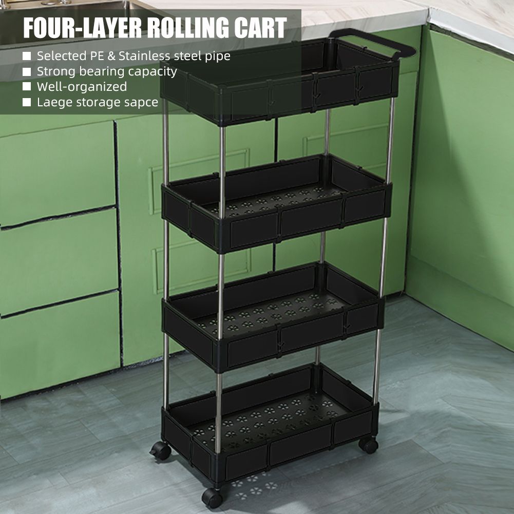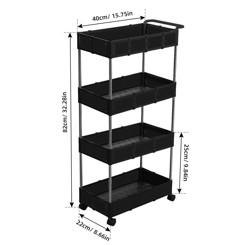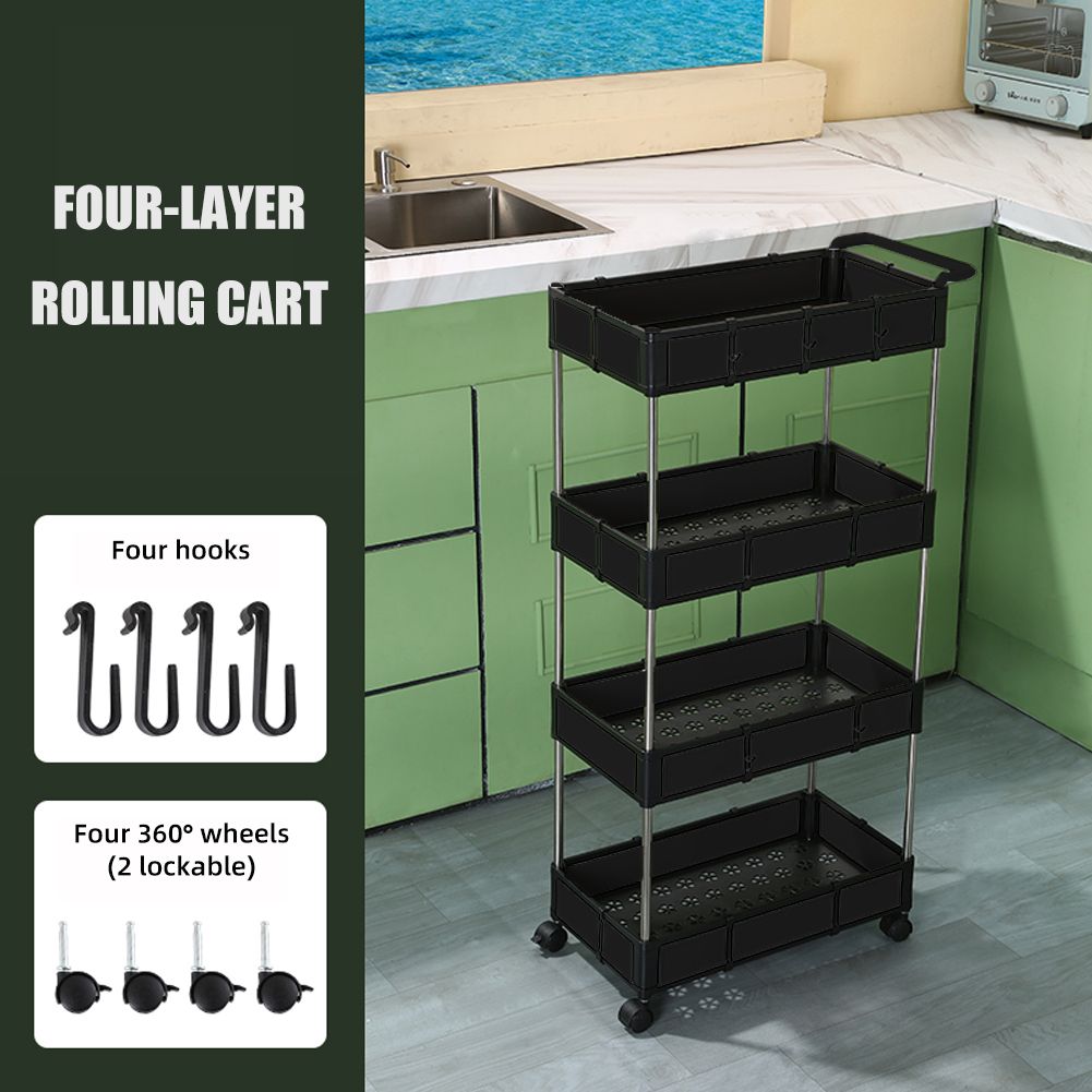 [LARGE STORAGE CAPACITY] This four-tier rolling cart measures about 40*22*82cm/ 15.75*8.66*32.28in, which boasts compact size while large capacity for kitchen s, snacks, books, toiletries and other household supplies. Moreover, 4 detachable hooks provide more storage room for s that can be hung.