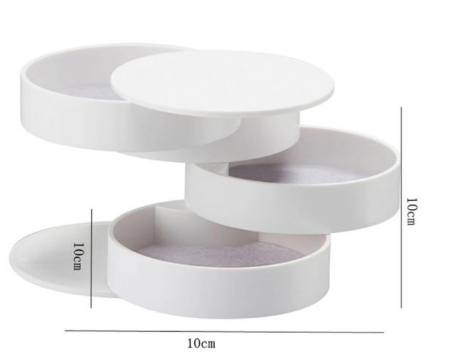· The 4-layer rotating storage design saves space so you can effectively store earrings, rings, necklaces, bracelets, lipsticks, cosmetics, car keys, or other small supplies neatly to avoid tangling