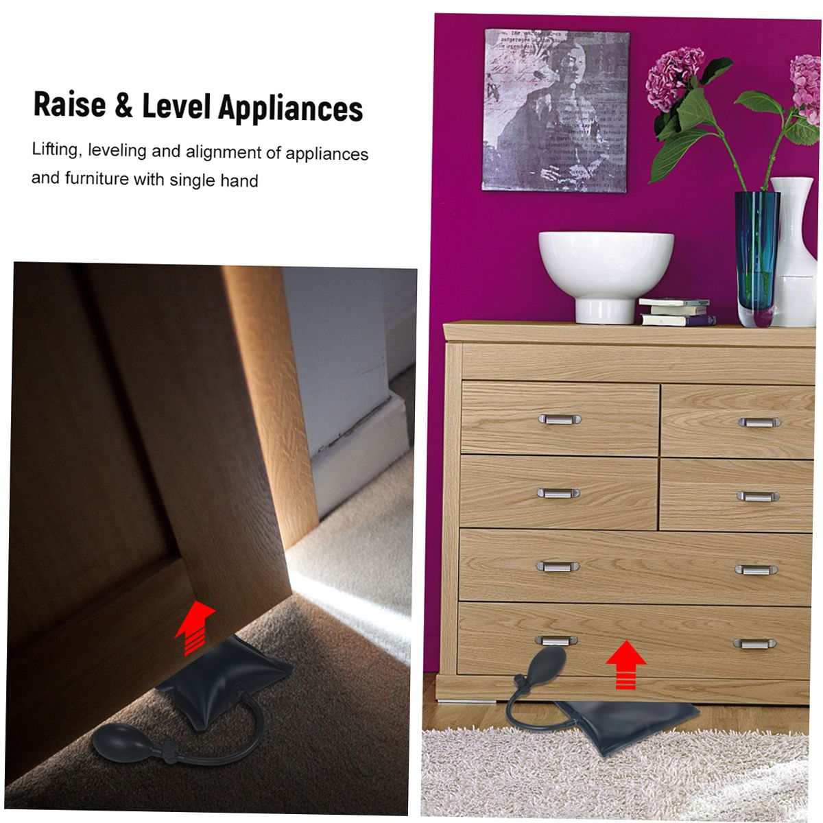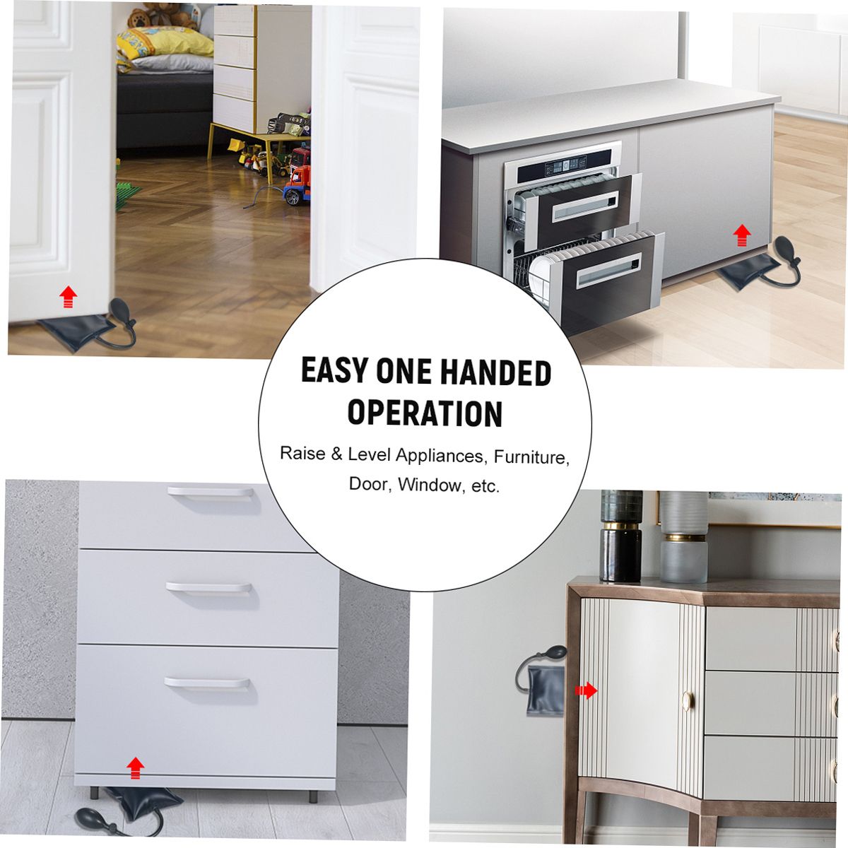 Effortlessly Operation -- Smart Air Wedge Bag Pump enable one person to do the job of many. You can hold in place and level countertops, door frames, window frames, cabinetry, and more! To raise, align, move and clean appliances, furniture, water tanks with one handed pump operation.
