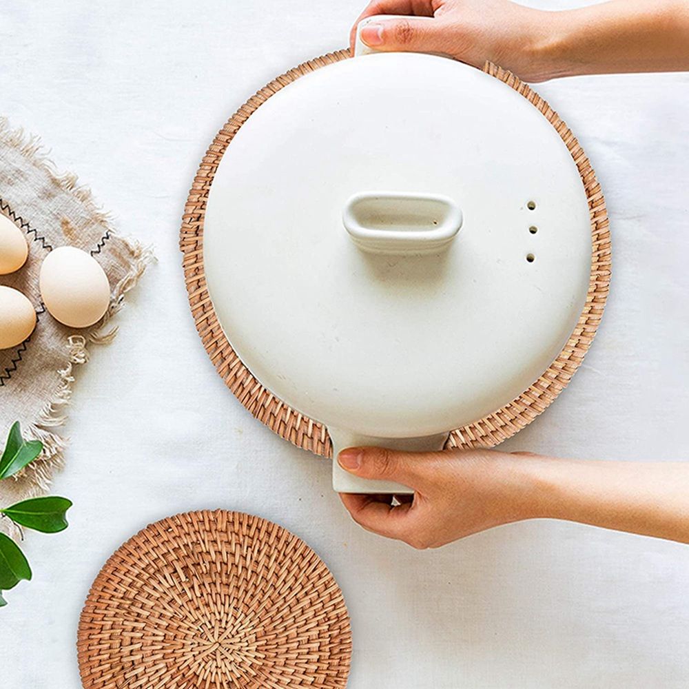 MATERIALS: These trivets are made with natural rattan with natural fragrance by hand woven and won't crack, not paint, smooth without prickly parts.does not fade or scratch, and leaves no stains or grease behind.