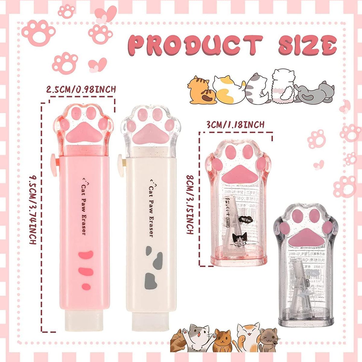 Detailed Dimension: the cat paw retractable pencil erasers measure about 9.5 x 2.5 cm/ 3.74 x 0.98 inches, and the cat paw cute pencil sharpeners are about 8 x 3 cm/ 3.15 x 1.18 inches, they are portable and lightweight, you can put them in your pencil cases, bags and book bags