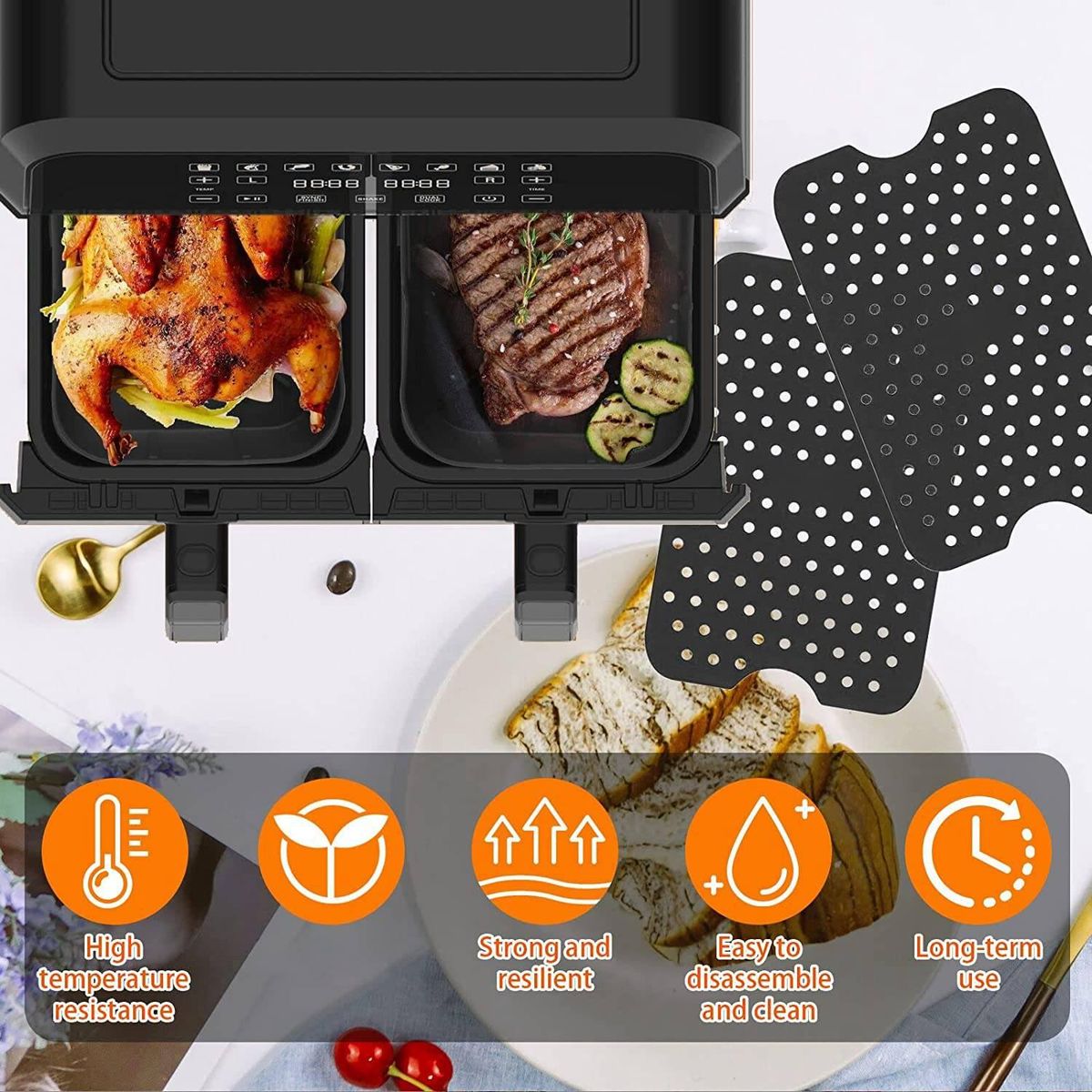 Intimate and practical design silicone liner is designed with handles on both sides to protect your hands from when taking out it And these liners are designed with enough and proper holes to optimal around the food Two different types of accessories to make cooking easier