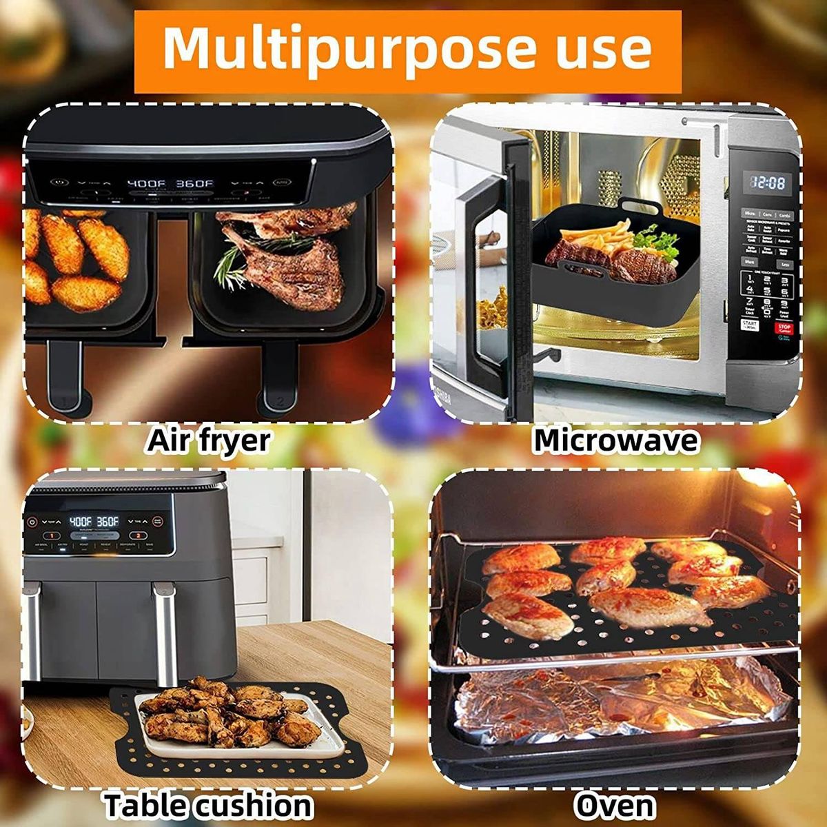 Practical design silicone liner for the is designed with handles on both sides to protect your hands from when taking out it And it helps the oil in the food flow to the edge of the tray while cooking preventing the food from soaked in oil