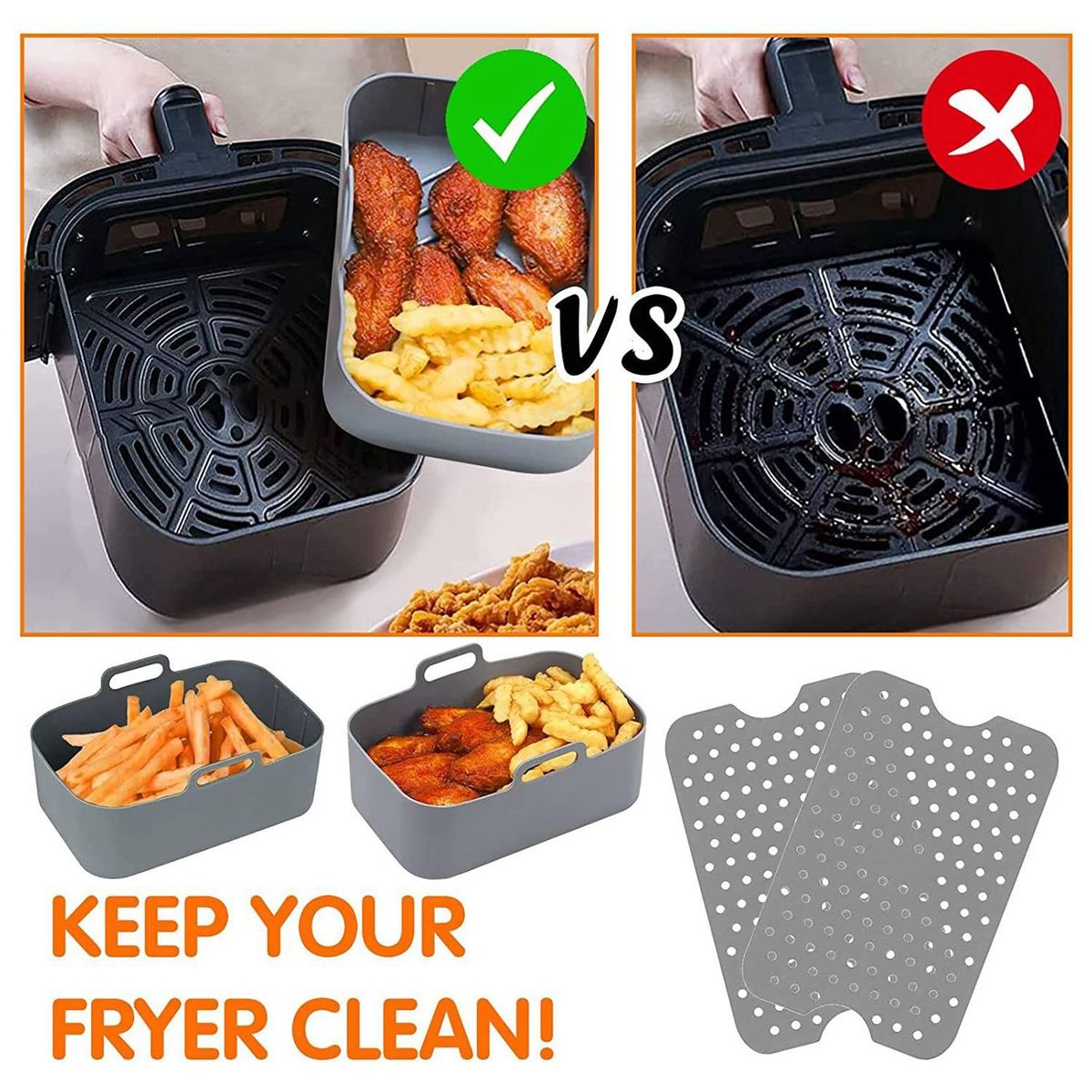 Practical design silicone liner for the is designed with handles on both sides to protect your hands from when taking out it And it helps the oil in the food flow to the edge of the tray while cooking preventing the food from soaked in oil