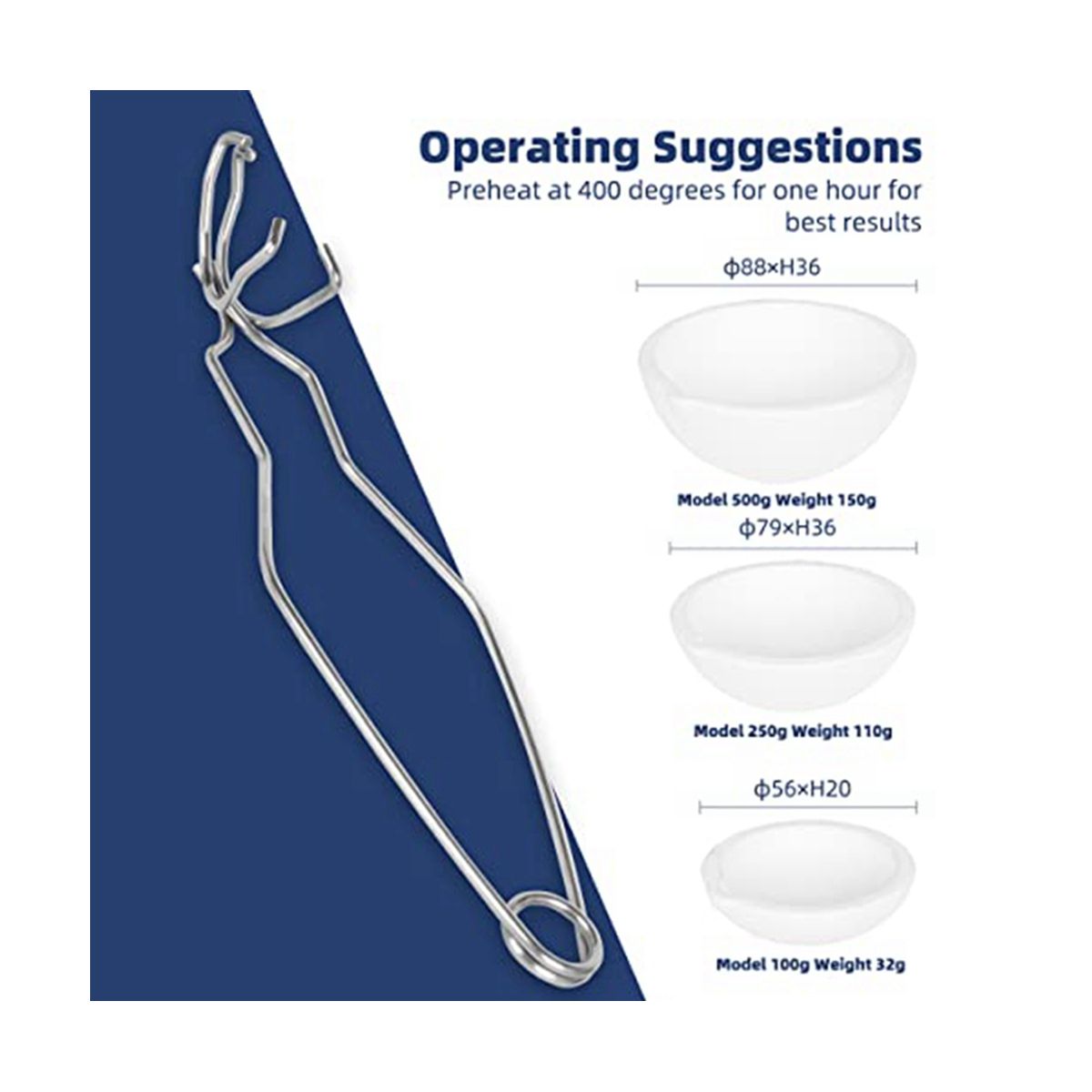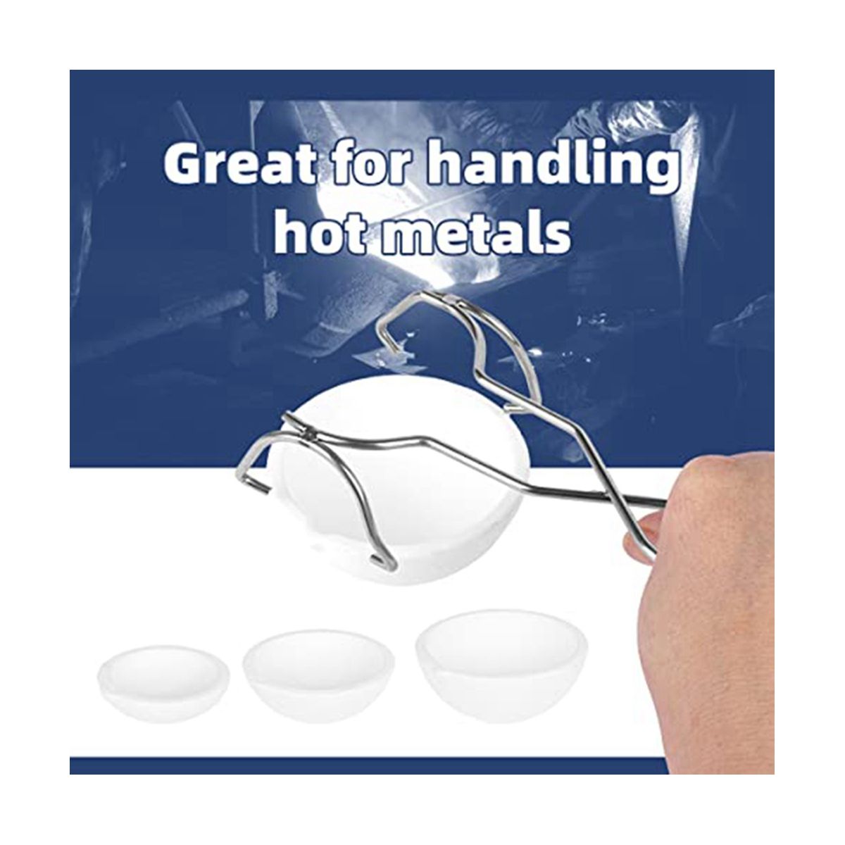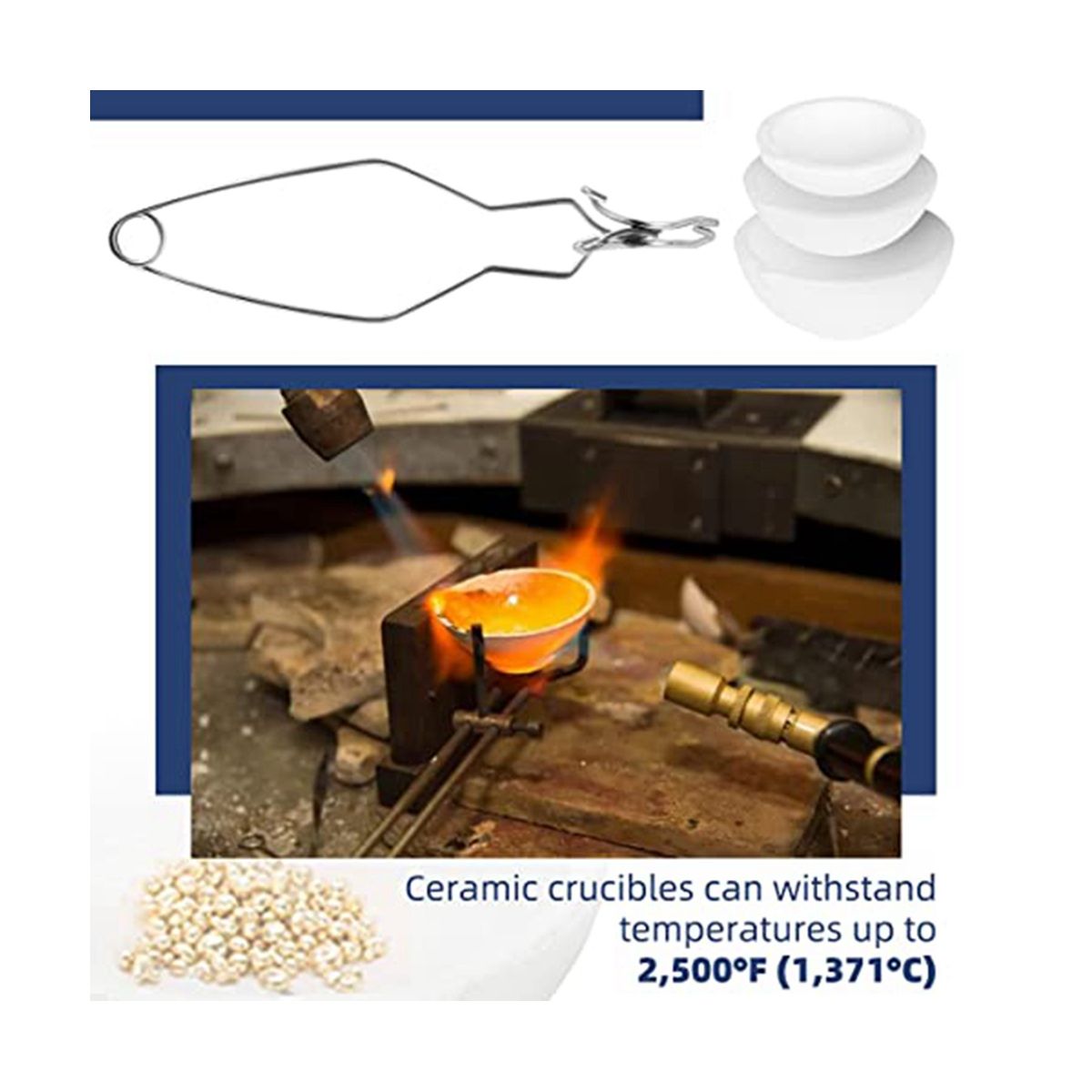 Includes: 3 types of crucibles (100G/250G/500G) and heavy duty stainless steel 14 inch long pliers whip handle 2A