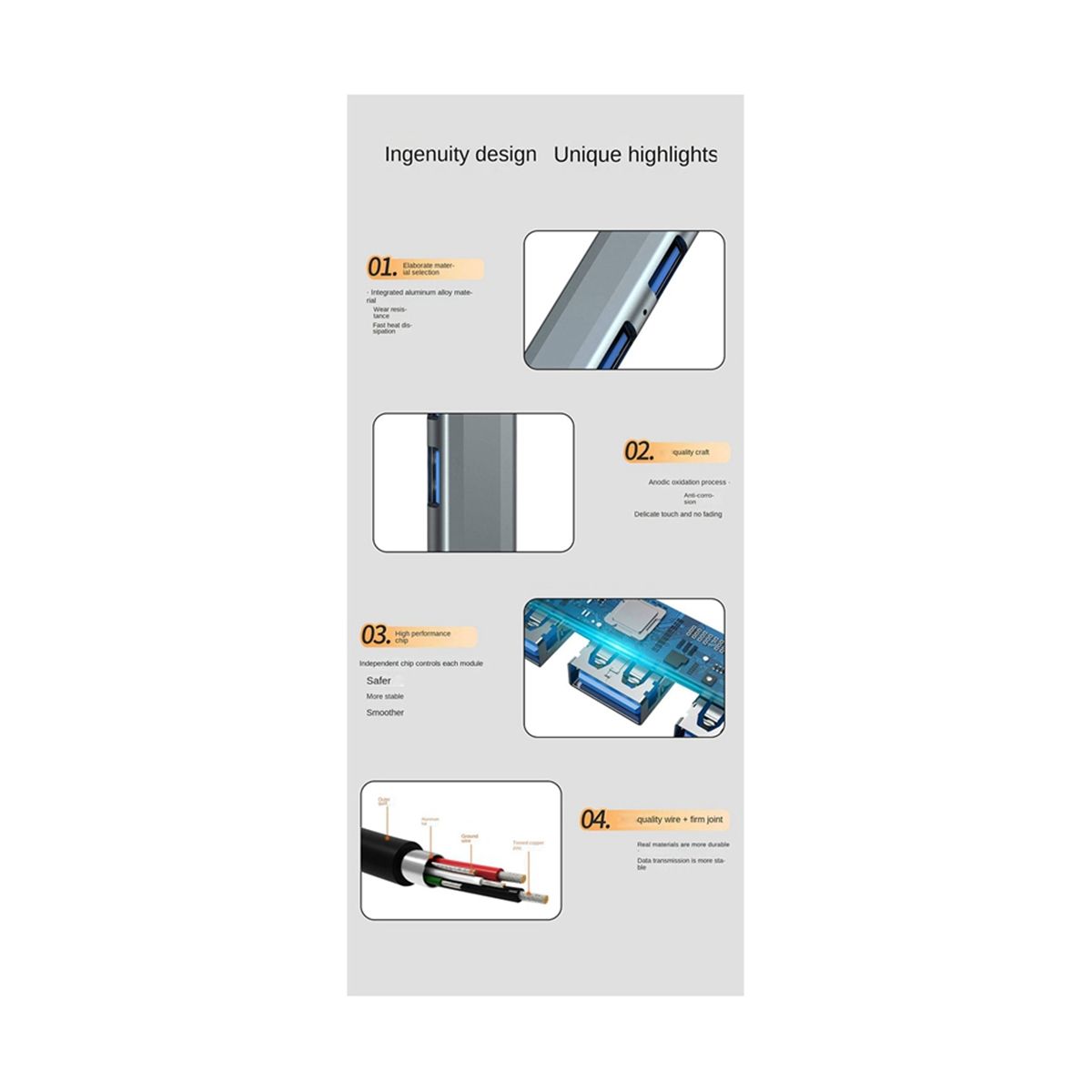 1. Simultaneous use of 4 ports: support simultaneous connection and use of keyboard and mouse, U disk, hard disk and other devices, with sufficient power supply and responsiveness