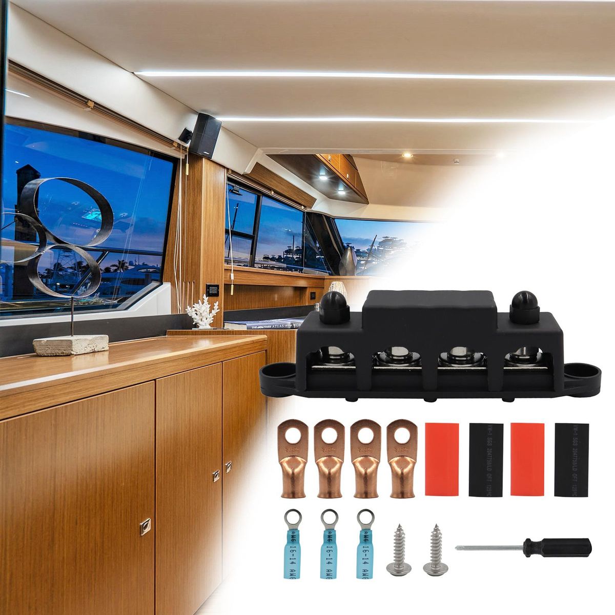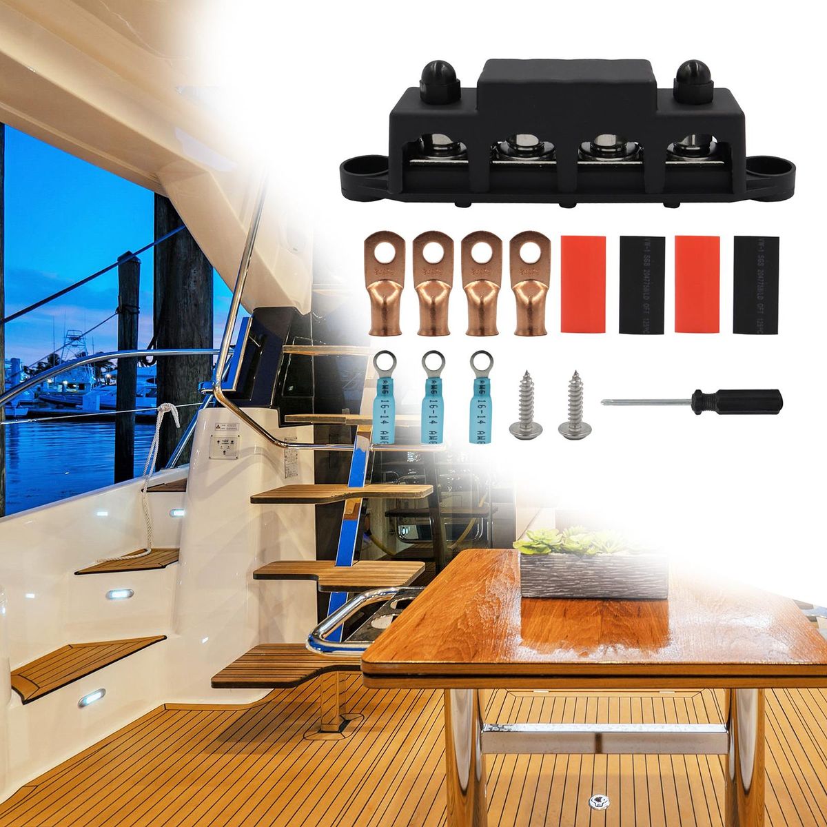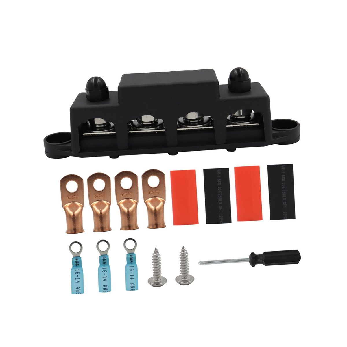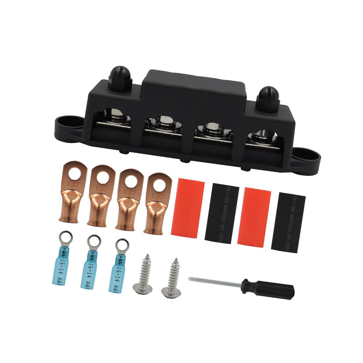 【Easy to Use】4 Post power distribution block bus bar, First insert the wire into the terminal, then open the protective cover, and finally pass the screw through the terminal, and tighten the screw to fix the terminal. The wires will not come loose.