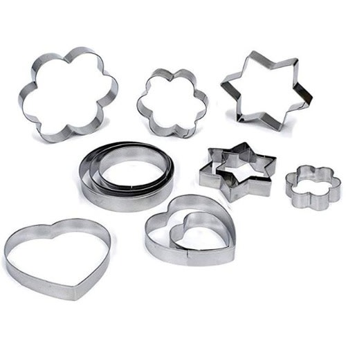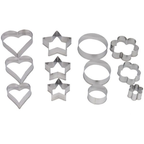 Material: Stainless Steel. Package includes 12 pieces in 4 different shapes . Shapes: Heart, Round, Star, Flower shapes. Metal cookie cutter is durable & easy to use for making cookies or decorating patterns for other pastries. Excellent gifting option for aspiring pastry chefs.