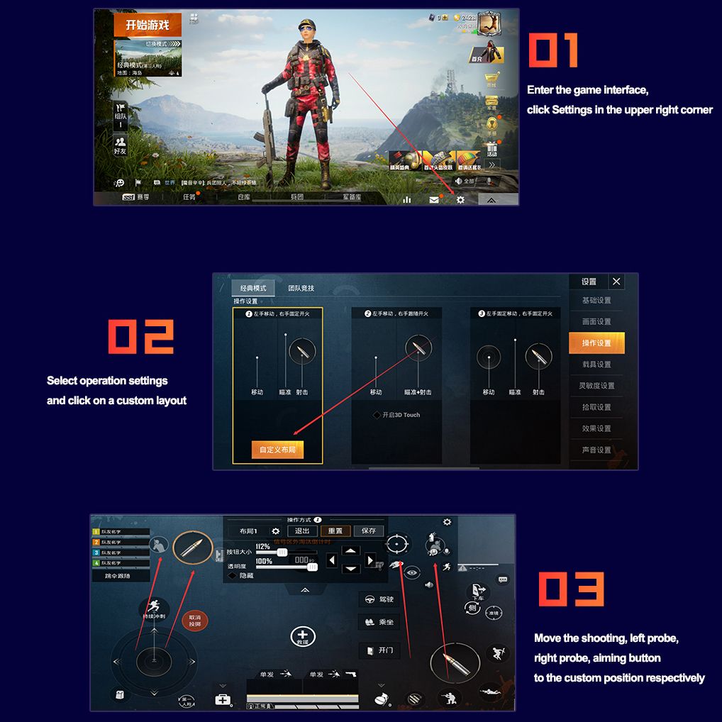 - SIX-FINGERS OPERATION support defines the button as you like, With this game controller, you can play games with 6 fingers aim, shoot, move left, and right at the same time. (open backpack, aim, jump, right probe, left probe, fall down, replace, shoot), the operation will be more smooth and accurate.