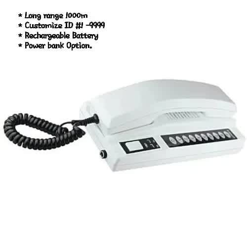 FEATURES:1. LCD display screen.2. Digital keyboard.3. Signal booster antenna.4. Long range of 500 to 1000m.5. 1 to 126 wireless extension units.6. ID customizable numbers 1 to 9999.7. Strong rechargeable 18650 battery( available in the local market)8. Volume, network signal, battery level, caller id, etc icon display.9. Power on/off button10. 4 level volume setting.11. Multiple ringtones selection.12. Hands free speak out.13. Power bank optional charging.14. USB power adapter & cable.15. Powerful standby power saver.16. Surface and wall mounting.17. Black & white available colours.