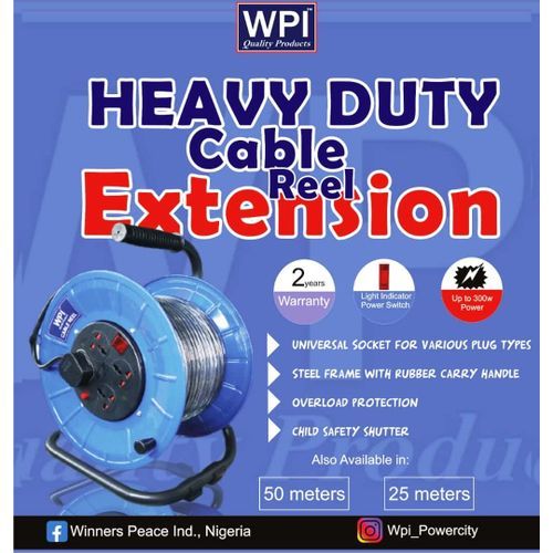 Heavy Duty extension1.5mm*50 metres2 years warrantyLight indicator power switchUp to 3000w powerUniversal socket for various plug typesSteel frame with rubber carry handleOverload protectionChild safety shutter 100% copper material