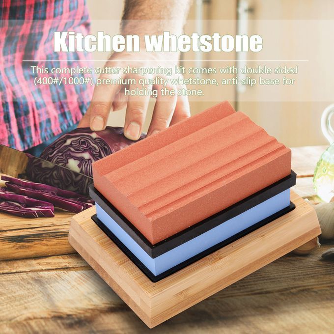 This complete cutter sharpening kit comes with double sided (400#/1000#) premium quality whetstone, anti-slip base for holding the stone.