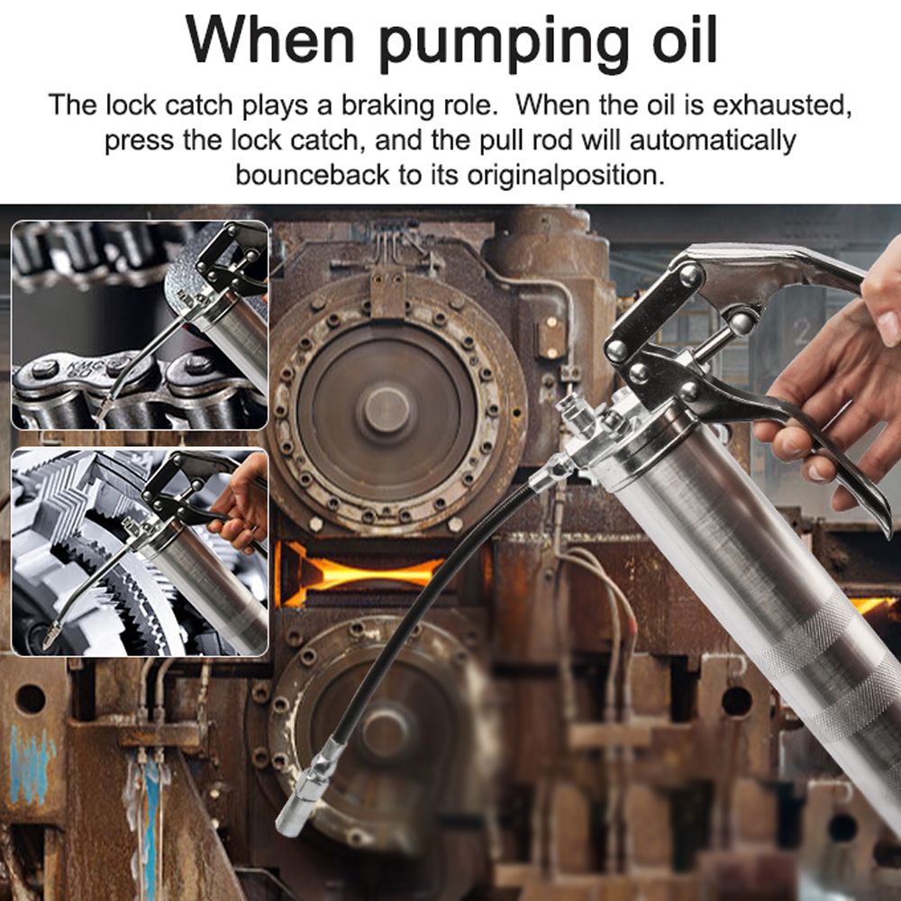 When pumping oil, the lock catch plays a braking role. When the oil is exhausted, press the lock catch, and the pull rod will automatically bounceback to its originalposition.