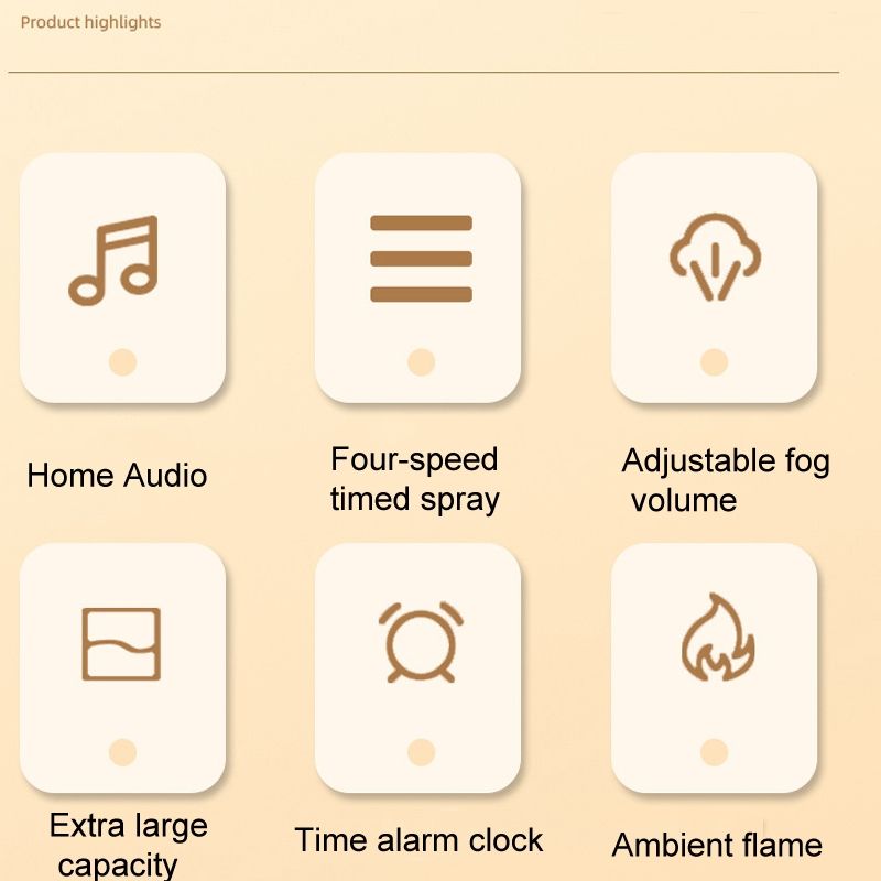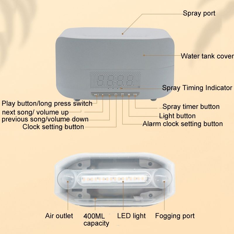 1. Product efficacy: humidification, aromatherapy, night light, clock / alarm clock, optional Bluetooth function