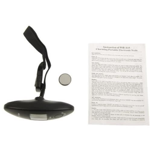 Features :4 weighing units : kg/ lb/ oz/ g.After 30 seconds witout hang goods or press the button, it will turn off automatically for energy saving.Easy to use and portable.LCD screen display with green backlight .Specification : Material : ABS plastic+Stainless steelColor : BlackCapacity : 50kgAccuracy : 10gSize : 11 x 7 x 3cmPower : 1x CR2032 button battery (included FOR FREE)