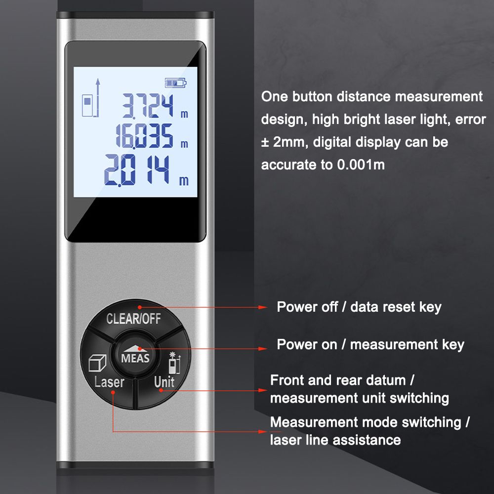 One button distance measurement design, high bright laser light, error ± 2mm, digital display can be accurate to 0.001m.