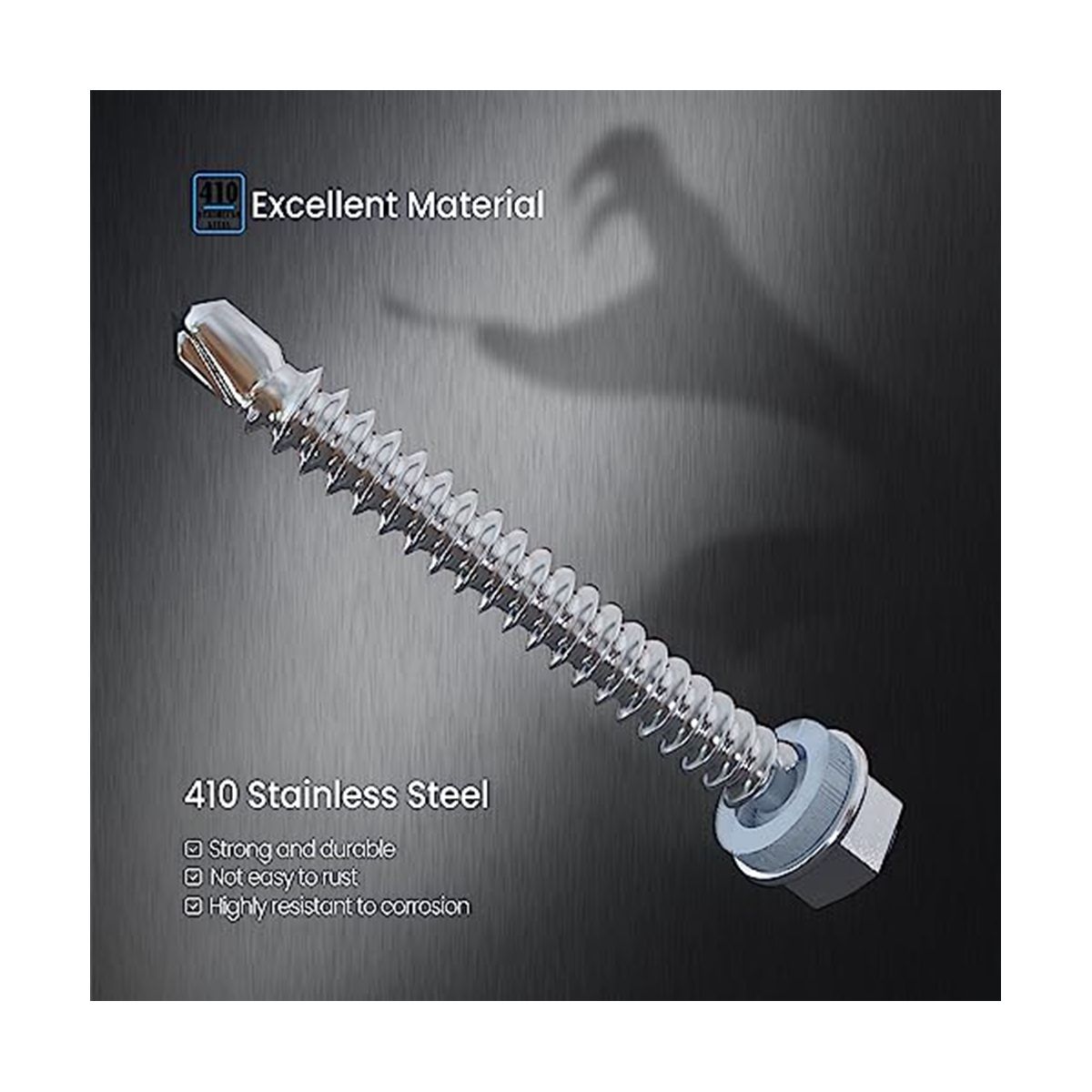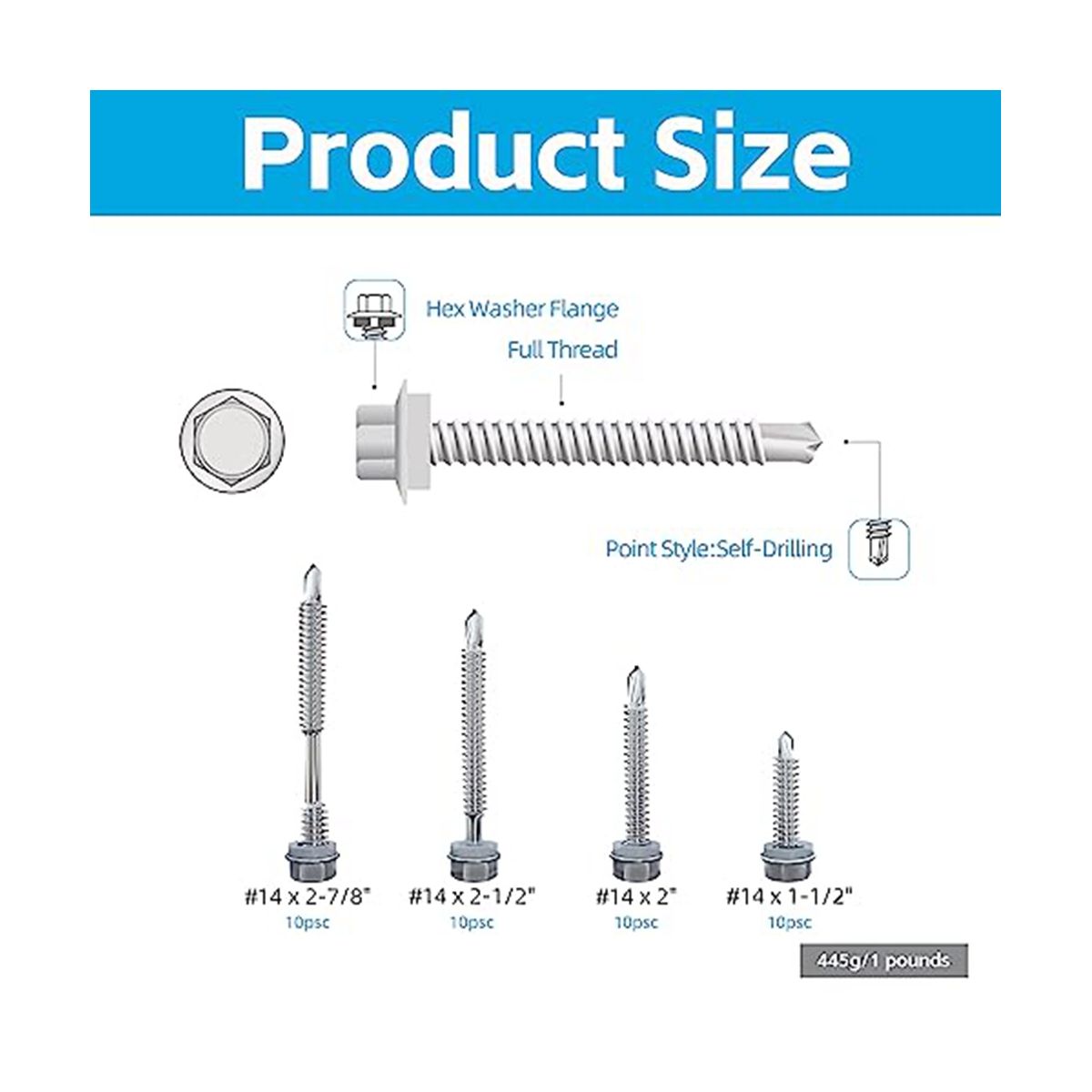 Rich Assortment: This link contains 40 self-drilling screws and many matching washers, #14 x 1-1/2 inch, #14 x 2 inch, #14 x 2-1/2 inch , #14 x 2-7 /8 inch , 10pcs each. 4 lengths can be closely matched to meet your daily needs.