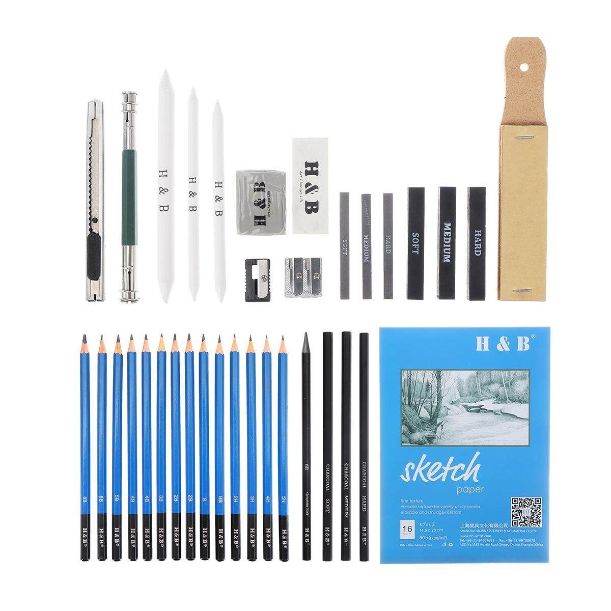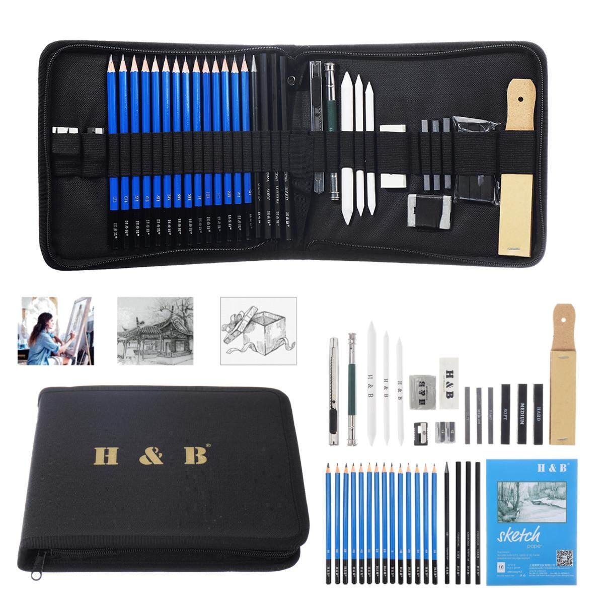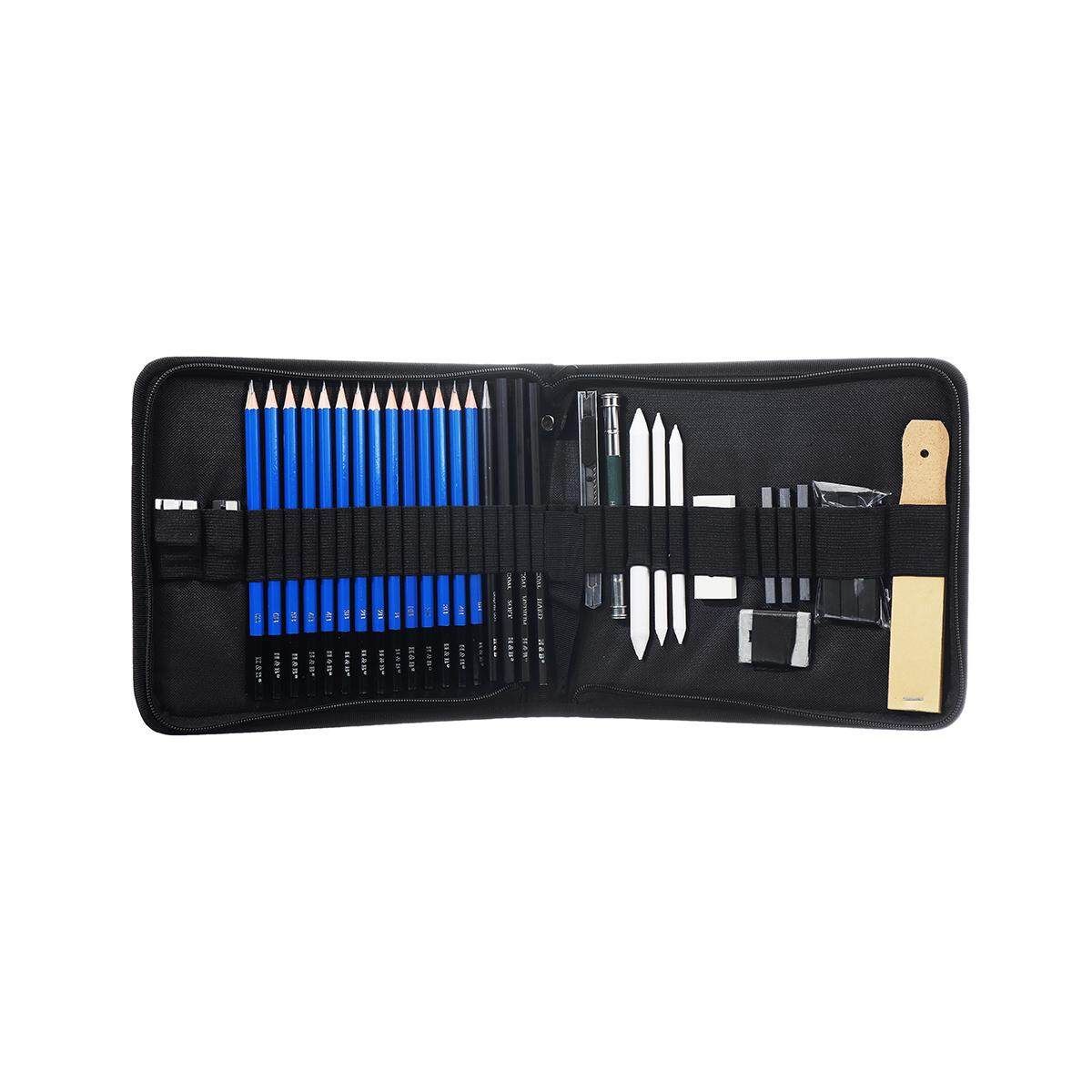 12 X Sketch drawing pencils(2H/3H/4H/5H/HB/B/2B/3B/4B/5B/6B/8B) 1 X Charcoal pencils: 6B 3 X Charcoal pencils ( / medium / hard) 4 X pencil 3 X Graphite rods 3 X Carbon rod 1 X Metal utility 1 X Double-headed pencil extension 2 X Solid paper pens 1 X Box of willow branches(4PCS) 1 X White Eraser 1 X eraser 1 X Sandpaper block 1 X Metal double hole pencil 1 X Plastic single hole pencil 1 X Storage Bag