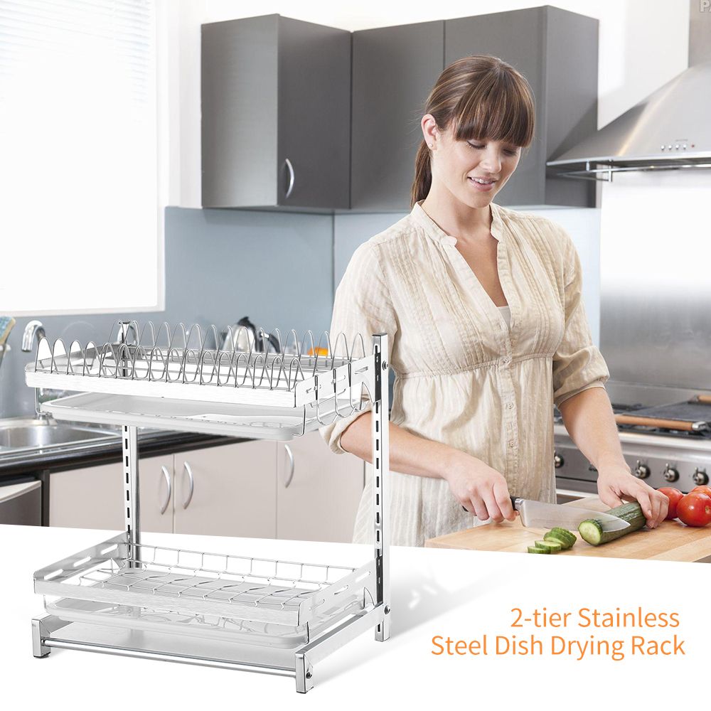 Durable and sturdy 2-tier dish drying rack takes advantage of your kitchen space, perfectly stores and organizes dinnerware, even fruit and vegetable. It\'s great for daily use in kitchen.