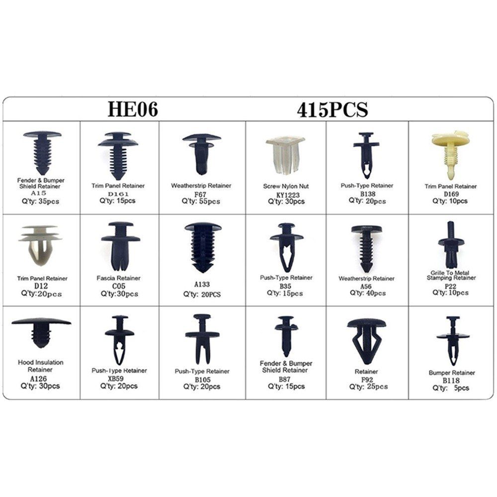 Do you need a box of car fasteners? There is a 415PCS car fastener suit, including different kinds that can be used on car door, panel, fender, pumper and so on. If you need one, it is your nice choice.