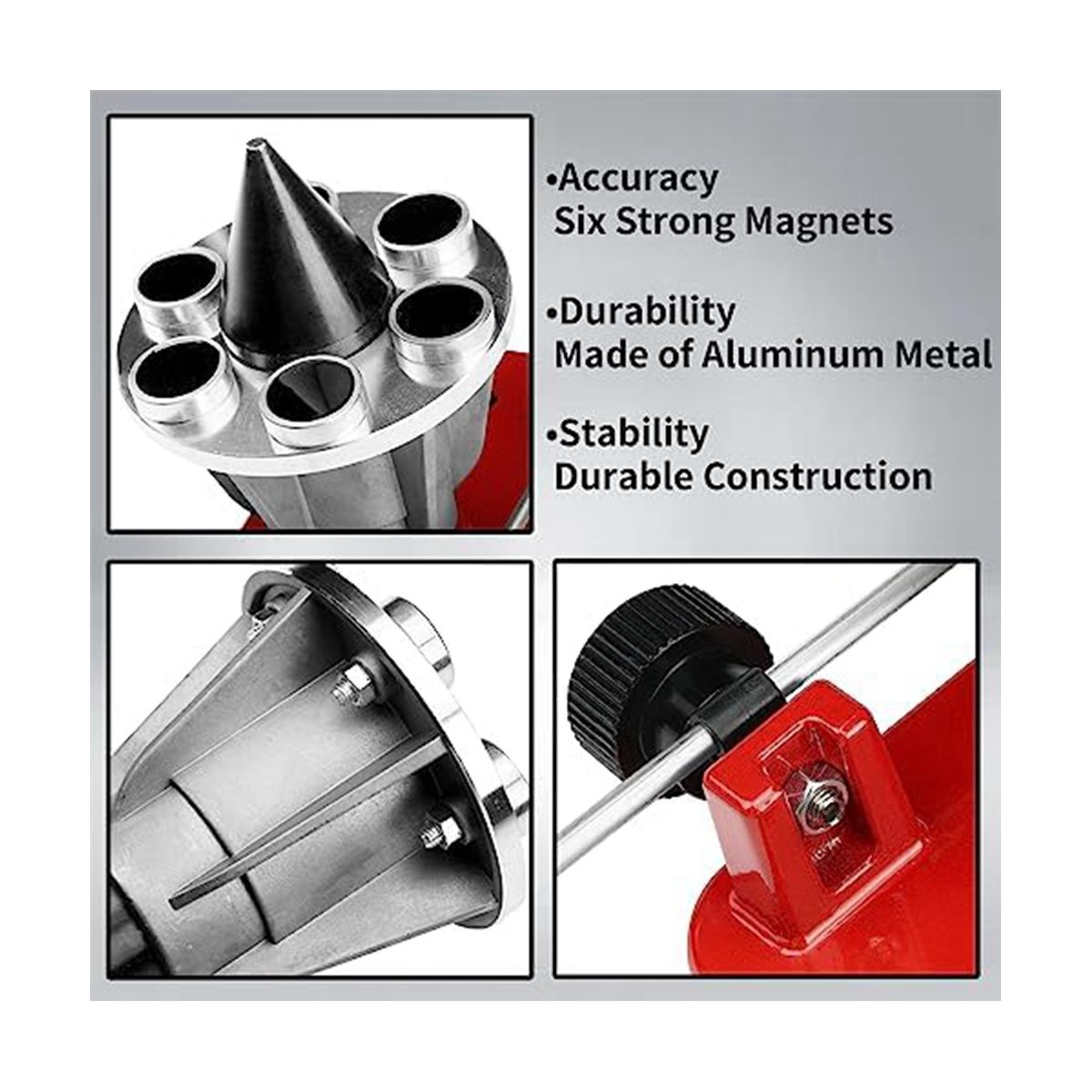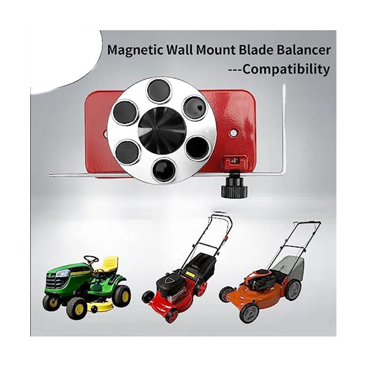 Magnetic wall-mounted blade balancer with 6 powerful magnets for high wear resistance and better durability, provides precise blade balance and prolongs the life of your lawn mower.