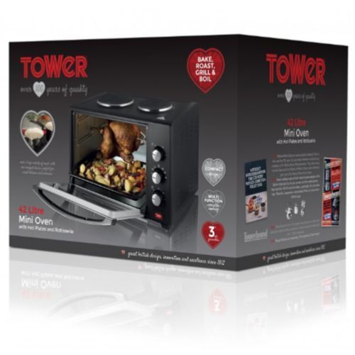 With an adjustable temperature ranging from 100 - 230 degrees with 3 oven functions, this mini oven makes it ideal for types of foods whilst the hot plates can be used independently or together. What's more, the 60 minute timer with bell enhances cooking accuracy, letting you focus on other tasks whilst your food cooks. Complete with an array of accessories including a baking tray, wire rack, tray handle and rotisserie fork and handle, this 42L Mini Oven makes both a versatile and compact addition to your kitchen.