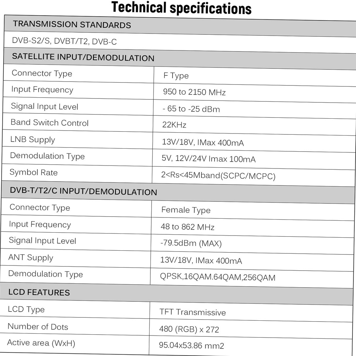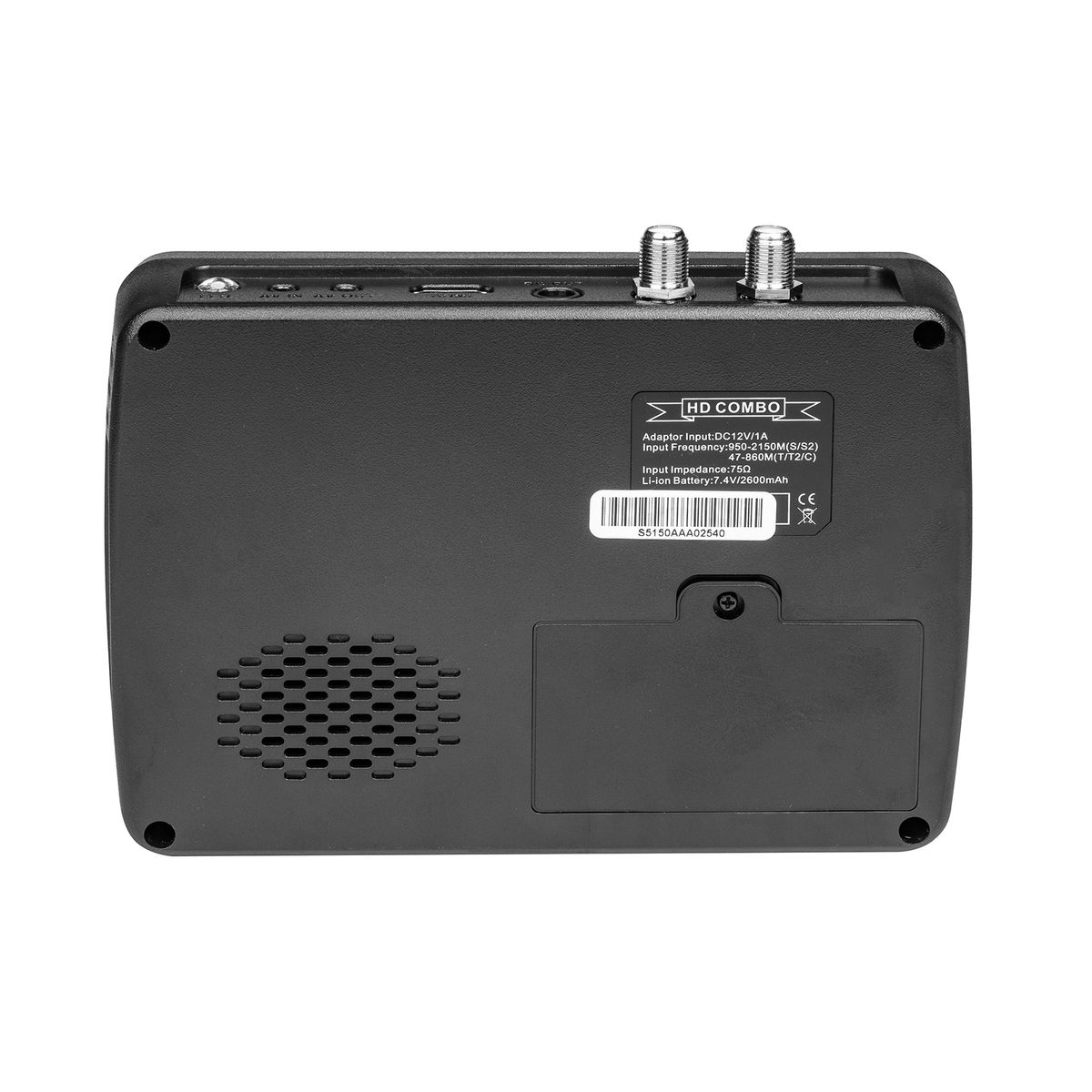 Compliant handheld combo meter. With its compact size, light weight, intuitive user interface, long battery operational hours and rich feature set, the meter provides all functions needed for installation and verification of digital Satellite TV service, antenna signal and cable signal to residential homes or multi-dwelling units.