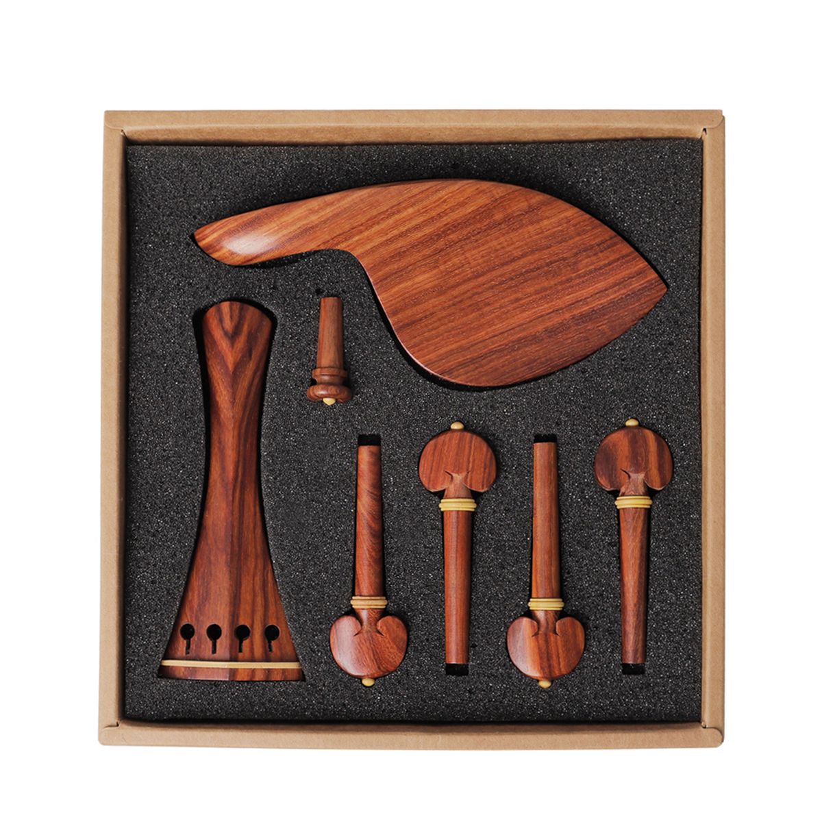 INCLUSION: Wooden accessories especially designed for 4/4 violins, including tailpiece, chin rest, end pin and tuning pegs.