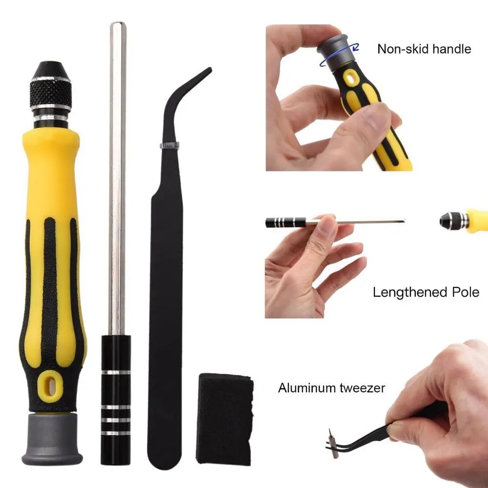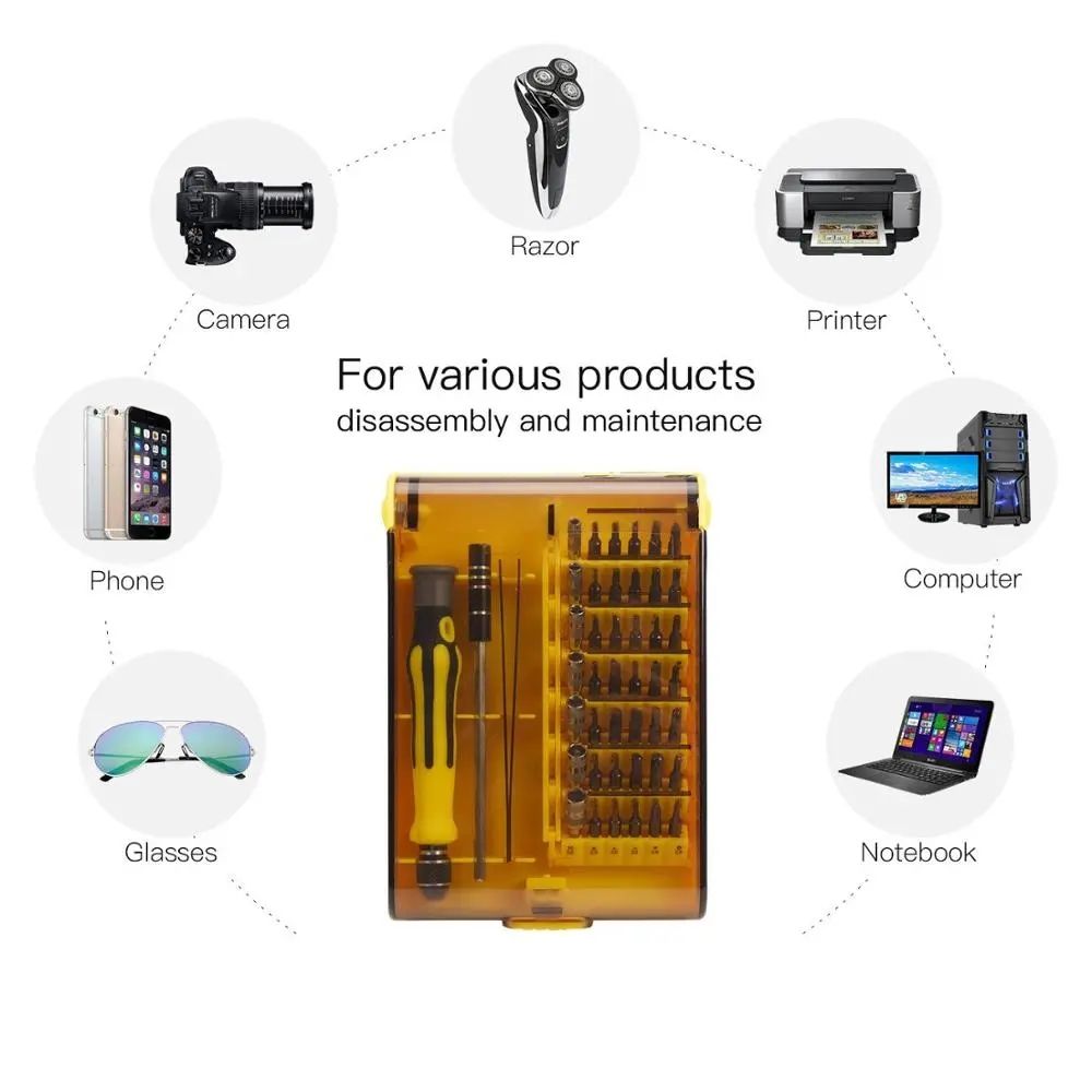 1.Brand new and high quality.2.45pcs in 1 screwdriver set includes 42 insert bits, 1pc rubber handle, 1pc extension rod and 1pc tweezery. Non-slip rubber design of handle for comfortable to operatey.3.Comes with extension rod can be inserted into the handle for length adjustmenty.4.It comes with plastic storage box for easy transporty.5.Please refer to picture for detailed types of insert bitsy.6.Made of sturdy steel with precision-machinedy.7.By using this set of tools, you can remove the small part of your cellphone/computer/Mp4...and repair the device without damaging it.8.With Retail Box and packed Safely in Bubble Bag.