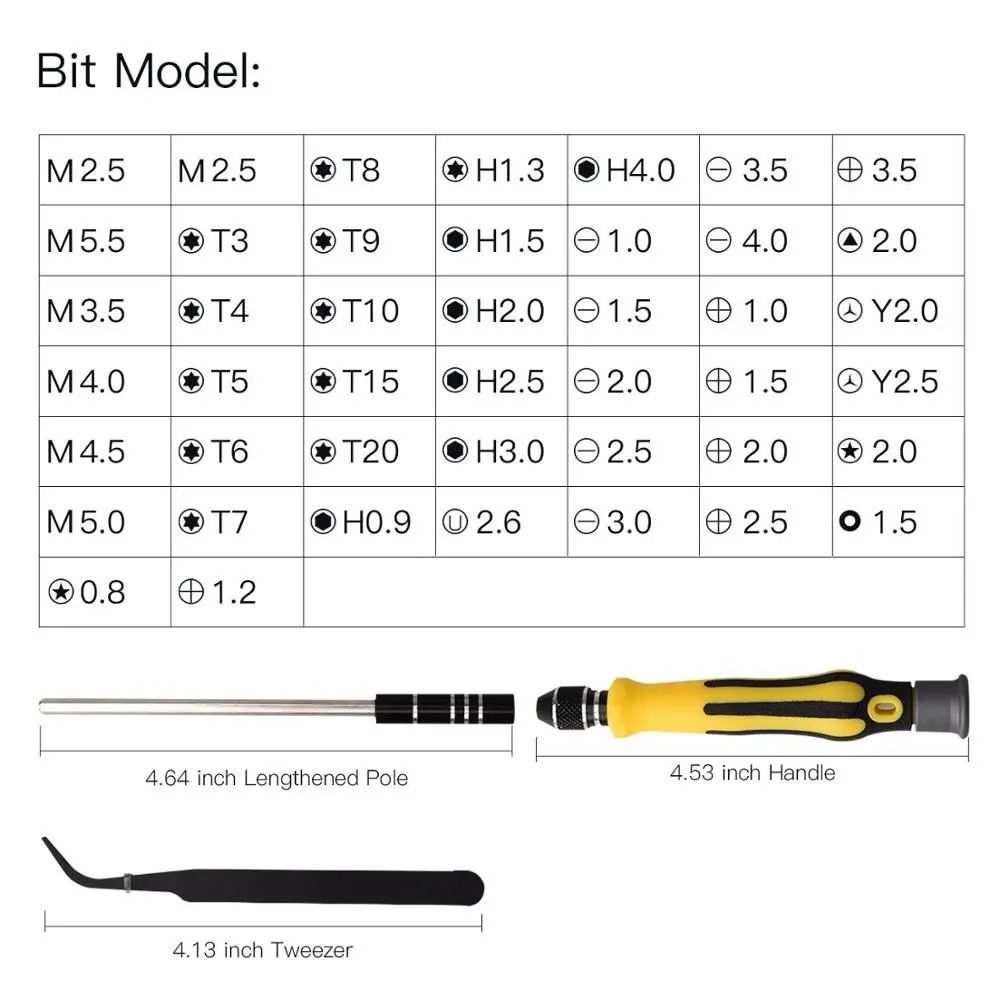Detail include :1 * 10cm Extended bar1 * 12cm Handle1 * 11.7cm Tweezers7 * CRV socket: M2.5, M3.0, M3.5, M4.0, M4.5, M5.0, M5.535 * Screw driver:10 * Torx screw driver: T3, T4, T5, T6, T7, T8, T9, T10, T15, T208 * Hex screw driver: H0.9, H1.3, H1.5, H2.0, H2.5, H3.0, H3.5, H4.05 * Cross screw driver 1.0, 1.5, 2.0, 2.5, 3.57 * Straight screw driver: 1.0, 1.5, 2.0, 2.5, 3.0, 3.5, 4.01 * screw driver: 2.01 * Star screw driver: 0.82 * Y screw driver: Y2.0, Y2.51 * Circle screw driver: 1.5