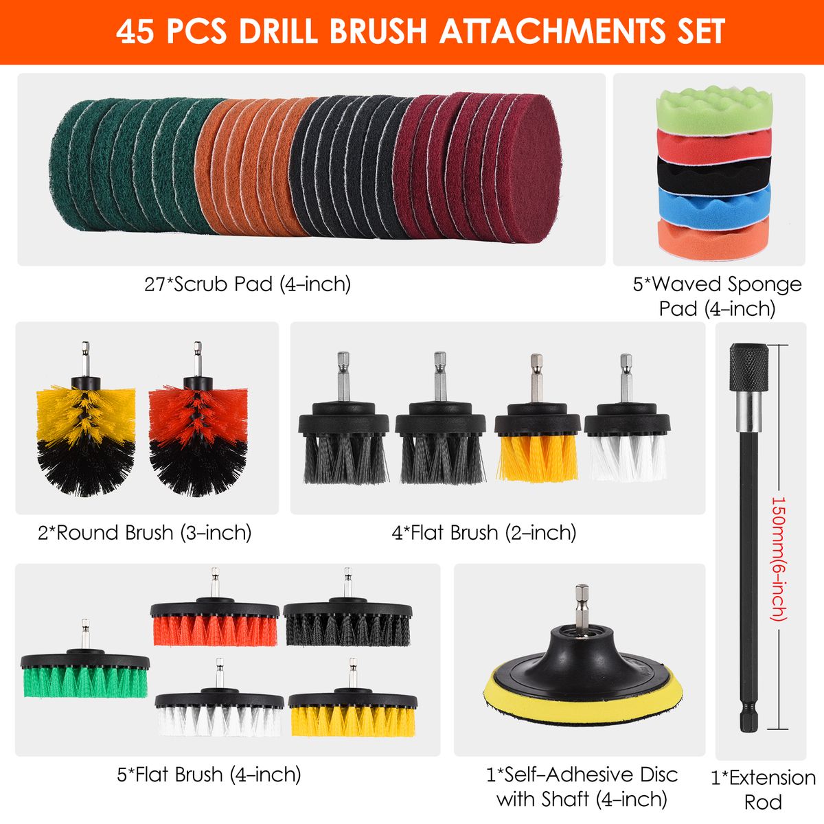 45 Pieces Drill Brush Attachments Kit: Includes 27 scrub pads (4in), 5 waved sponge pads (4in), 11 brushes (2in/ 3in/ 4in/ 4.5in), 1 self-adhesive disc (4in) and 1 extension rod. Time-saving and labor-saving with power drill (not included).