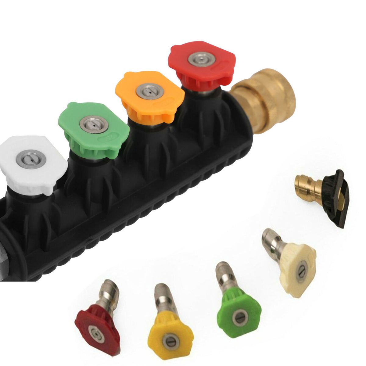 Includes 90 degree quick connect pivoting coupler to connect between the wand and nozzle tip. Different spray angles allow for different uses. This complete set of pressure washer nozzle tips allows you to apply soap and detergents, spray hard to reach places like crevices in sidewalks and driveways.