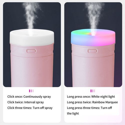 Description: The colorful mist humidifier adapts nano-spray technology to ensure fine spray mist and no water droplet will be left on your desk. It not only helps adjust dry air in the air-conditioned room but also moisturizes your skin, relieves nasal congestion, and purifies the air, keeps you healthy all the time.