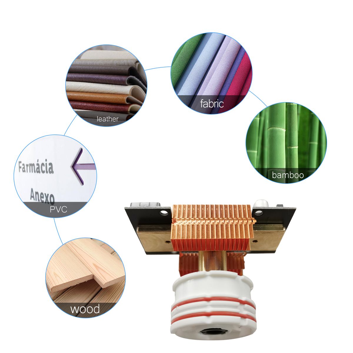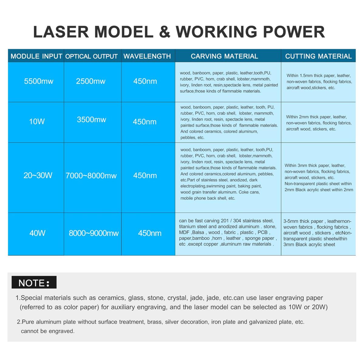6 kinds of module power optional (5.5W/ 10W/ 20W/ 30W/ 40W). Different laser modules for engraving/ cutting different kinds of material and different thicknesses.