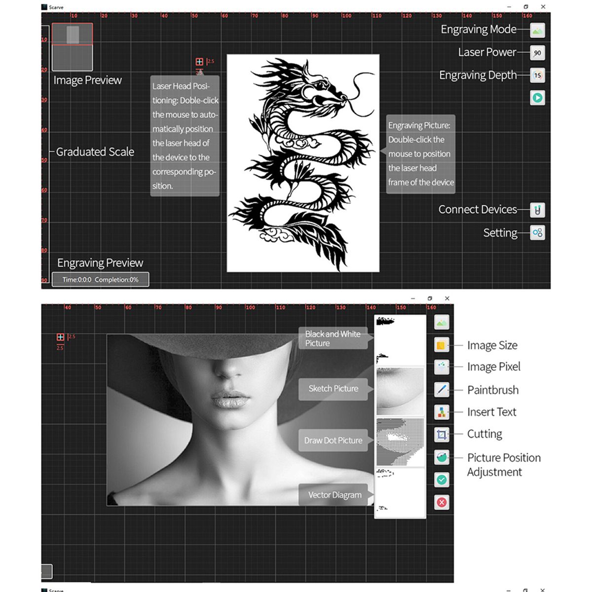 Engrave Mode: Image Engraving, Text Carving, Contour Carving, Pixel Carving