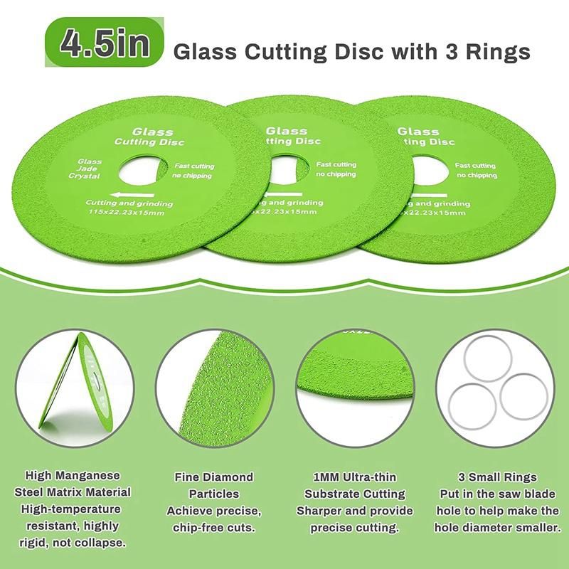 [Easy to use] - thin blade wheel of glass cutting disc for angle grinder. Equipped with 3 small rings, you can place in the saw blade hole to help reduce the hole diameter. Easy to install and use, can withstand continuous cutting for a long time.