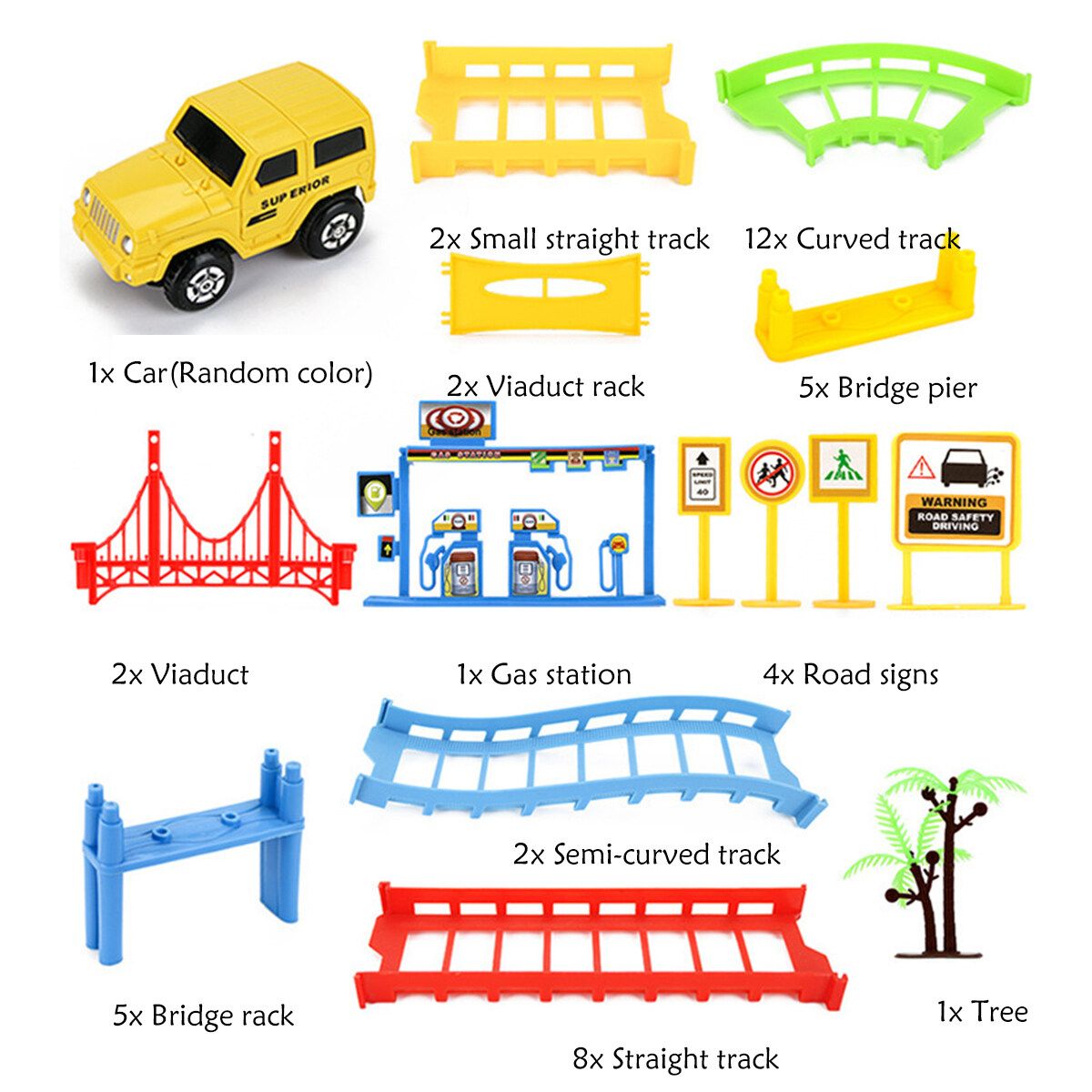 Content: 1x Car(); 2x Small straight track; 2x Viaduct rack; 12x Curved track; 5x Bridge pier; 2x Viaduct; 1x Gas station; 4x Road signs; 5x Bridge rack; 2x Semi-curved track; 8x Straight track; 1x Tree