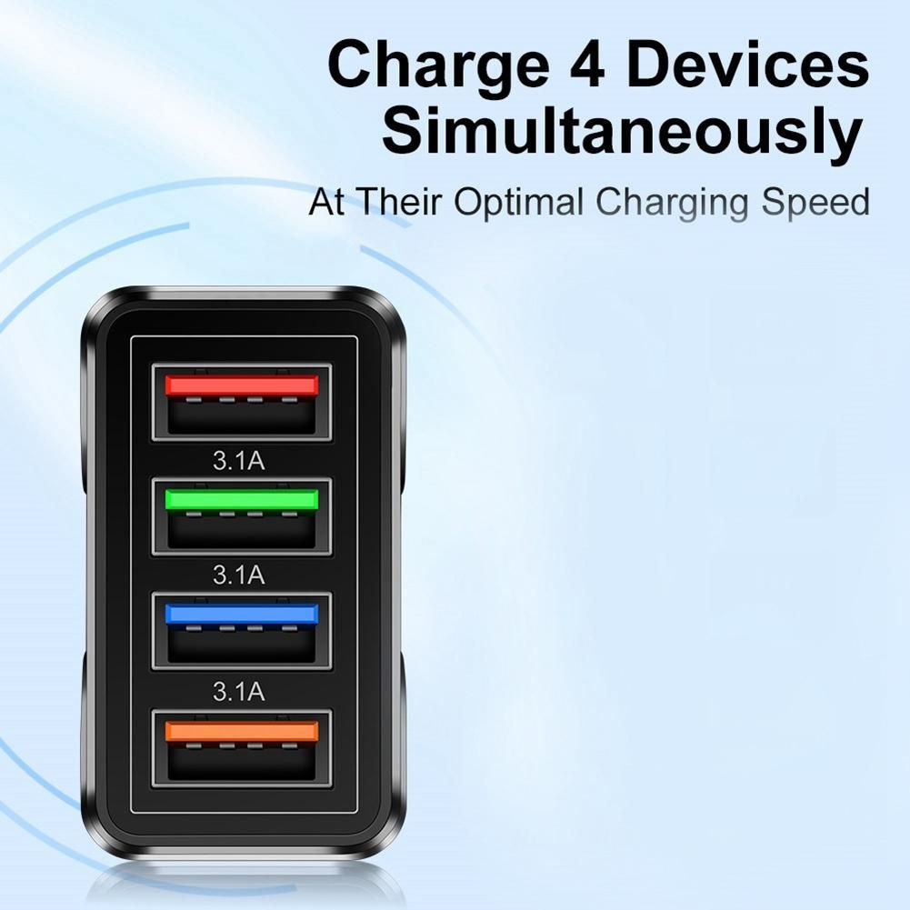 2. 4 USB ports ( quick charge 3.0 and 3 usb port 5V/3.1 A Max ), charging 4 devices at the same time.
