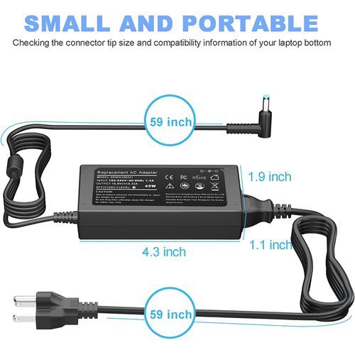 Input: 100 - 240V 50-60HzOutput: 19.5V - 2.31A 45 wattConnector Size: 4.5*3.0mm (Blue Tip)